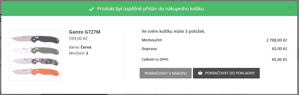Po vložení do košíku se potvrzovací okno zeptá, chcete-li v nákupu pokračovat (pak se okno zavře) a nebo jít do pokladny (tedy zobrazí se všechny položky, které máte v košíku).