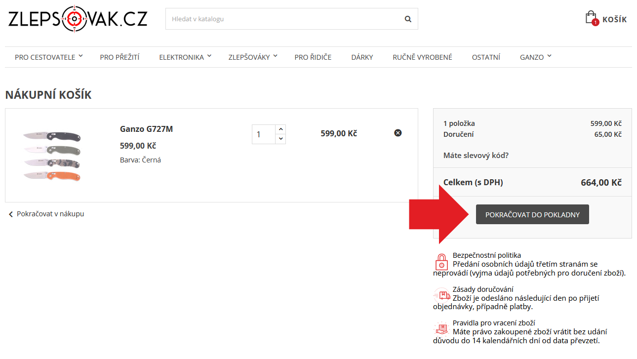 Pokud jste neotevřeli košík rovnou po vložení zboží, pak ho najdete nahoře, na pravé straně, kde je malá ikonka s obrázkem košíku a nápisem KOŠÍK. V košílku vidíte rekapitulaci zboží vložených do košíku a můžete pokračovat do pokladny.