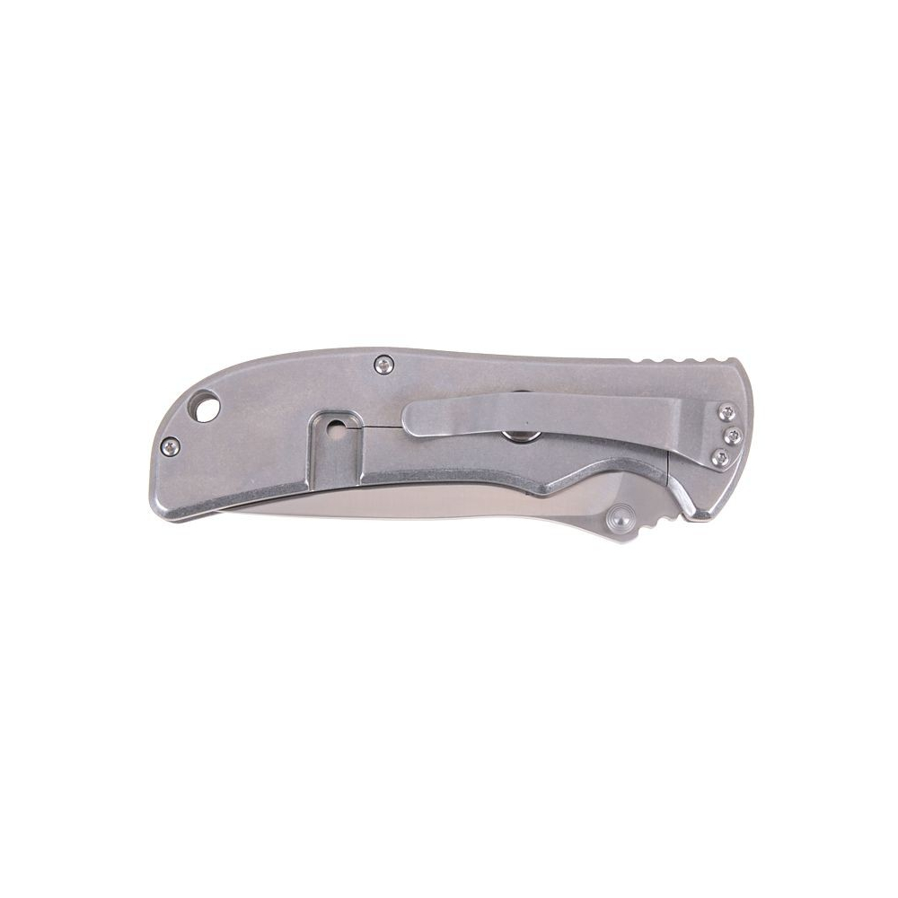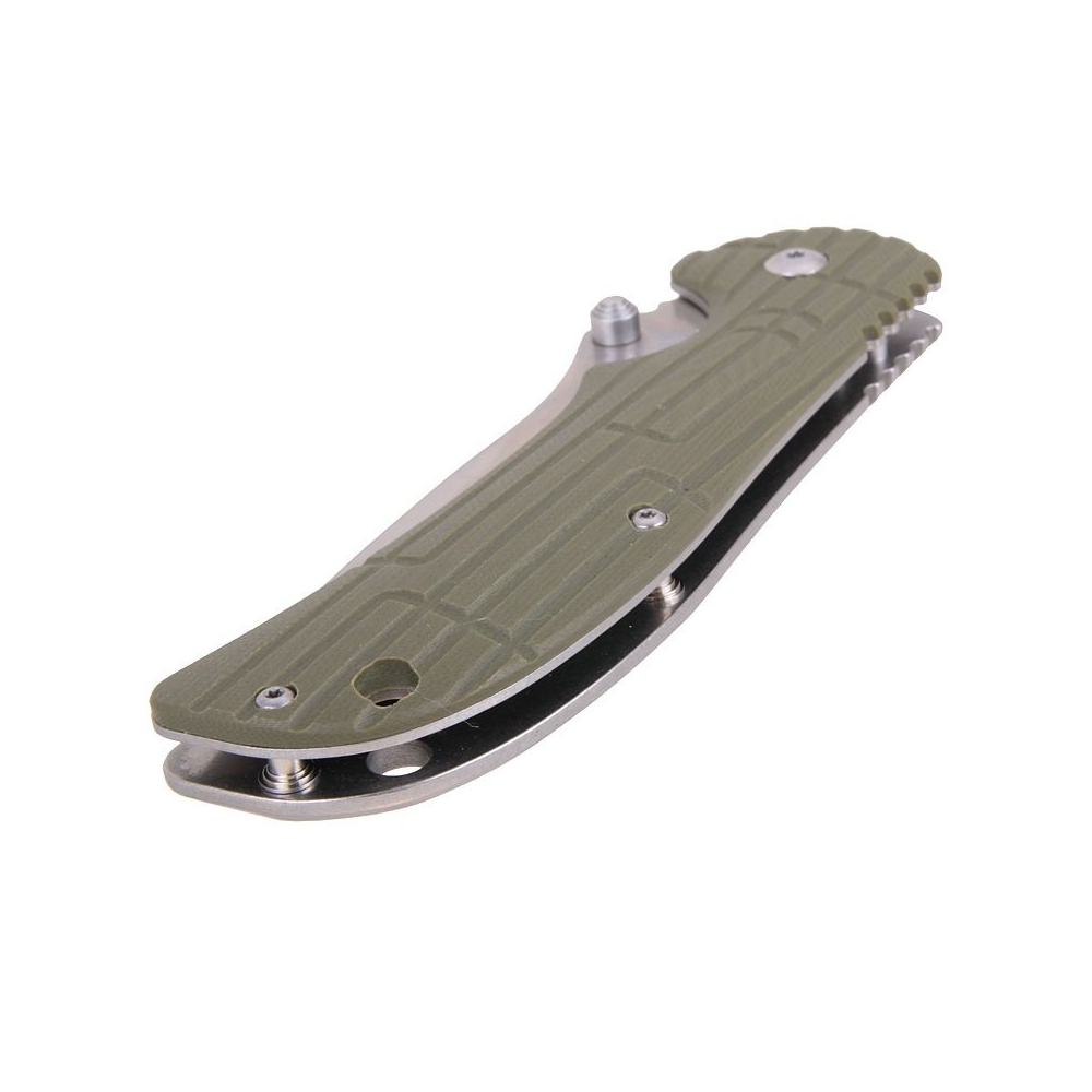 Tělo nože je také z nerezové oceli. Na jedné straně je klip, kterým upevníte nůž, na druhé straně je střenka z materiálu G10. Povrch G10 je záměrně hodně profilovaný pro pevnějsí držení nože v ruce. Dostupné barvy jsou: zelená, oranžová a černá. Kromě toho má rukojeť nože malý otvor pro např. provlečení Paracordu.