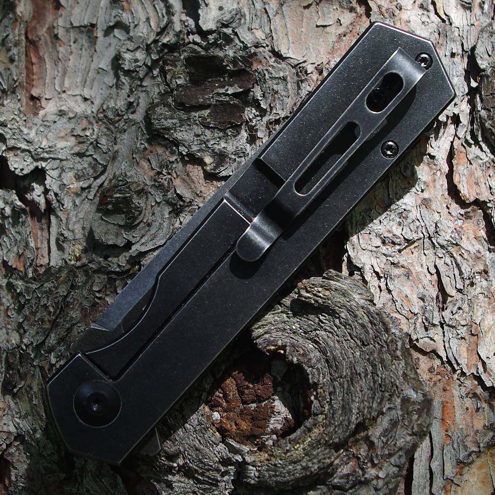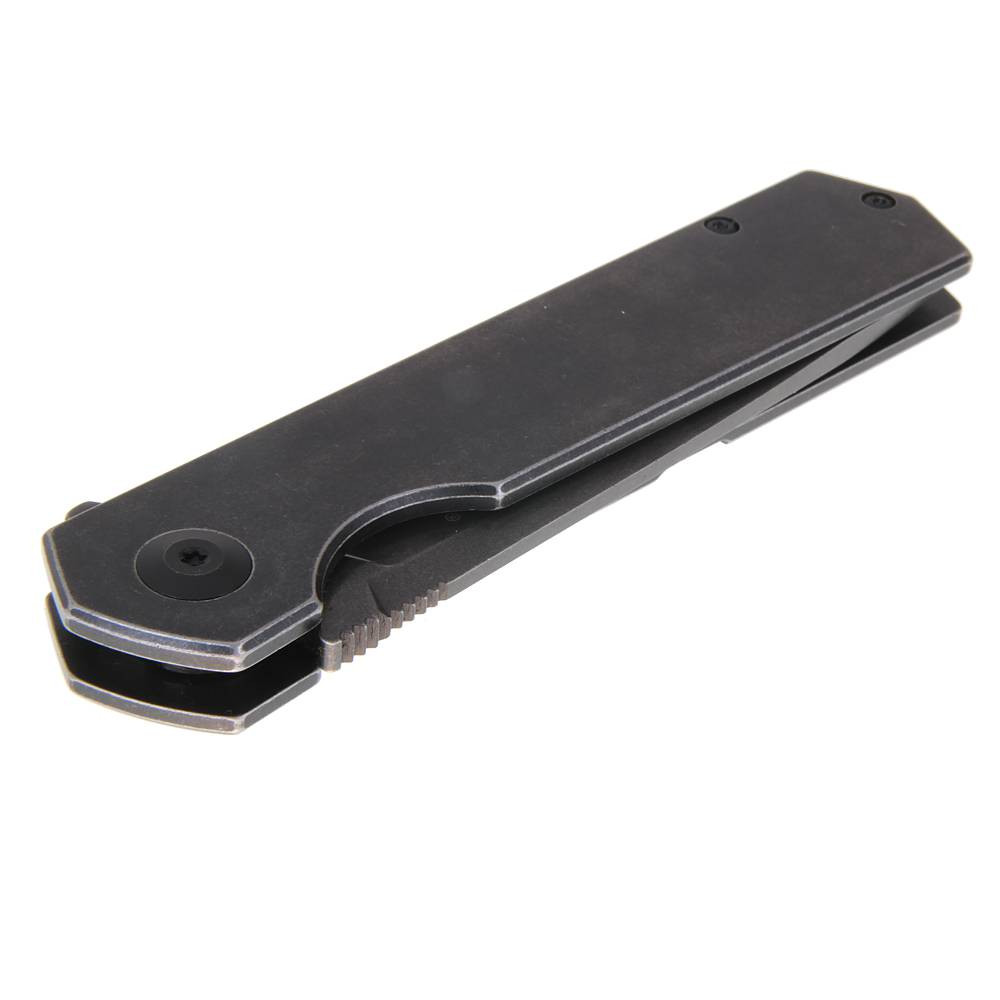 Rukojeť je vyrobena z nerezové oceli s vyšší odolností proti korozi, což z tohoto nože činí skvělého společníka do přírody – na ryby, lov i turistiku. Povrch rukojeti má stejnou úpravu jako čepel, takže celý nůž působí jednotným a elegantním dojmem. Na jedné straně je umístěna praktická kapesní spona pro pohodlné nošení.