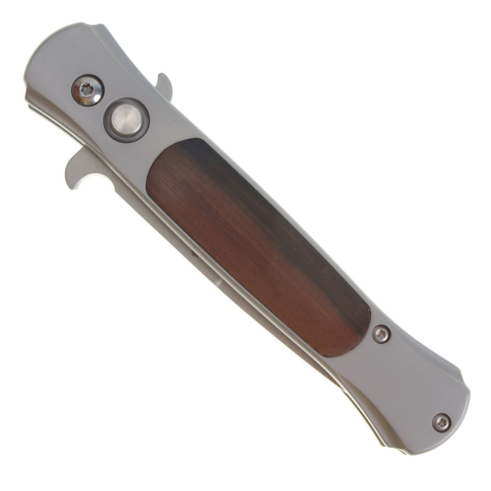 Rukojeť je vyrobena z nerezové oceli a doplněna elegantními dřevěnými střenkami, které zajišťují pevný a pohodlný úchop. Součástí rukojeti je také praktická kapesní spona, díky které lze nůž snadno připevnit k opasku nebo výstroji.