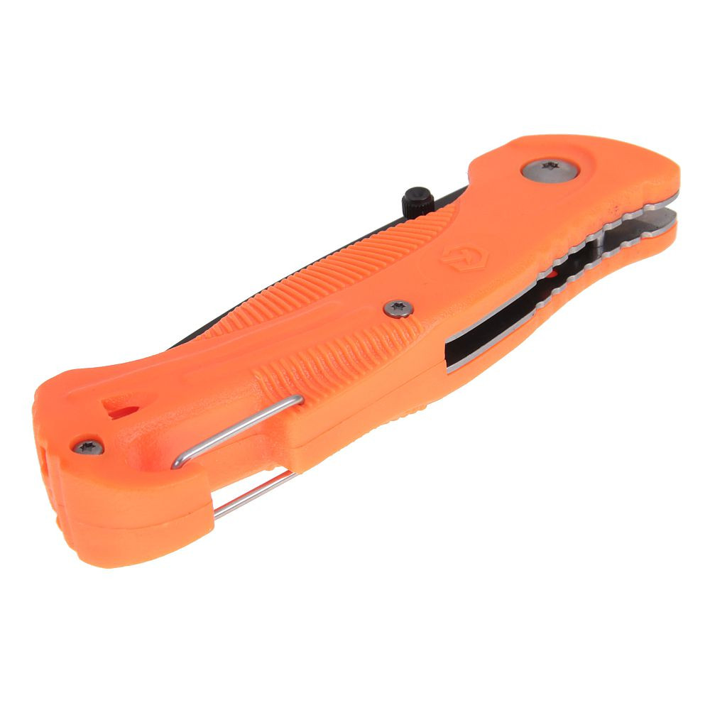 Ergonomicky tvarovaná rukojeť z odolného černého plastu perfektně padne do ruky a zajišťuje bezpečný úchop. Tento model se odlišuje integrovanou píšťalkou v rukojeti, která může být v krizových či nouzových situacích neocenitelným pomocníkem. Praktickým doplňkem je také karabina, díky níž lze nůž snadno připnout k opasku, batohu nebo výstroji a mít jej vždy po ruce.