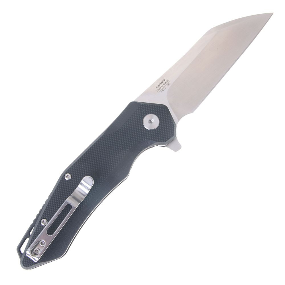 Rukojeť je vyrobena z odolného kompozitního materiálu G10, který je pevnější než běžný plast, odolný proti slunečnímu záření, vodě a mechanickému namáhání. Ergonomický tvar a texturovaný povrch zajišťují bezpečný a pohodlný úchop i při dlouhodobém používání. Na konci rukojeti jsou otvory pro připevnění šňůrky a kovová klipsa, kterou lze v případě potřeby přesunout.