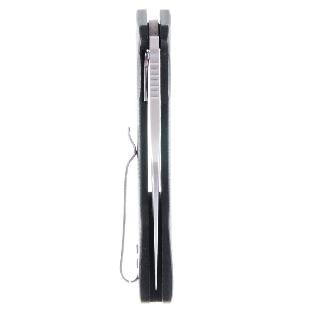 Čepel o délce 81 mm má tvar Clip-Point se sníženým hřbetem a falešným ostřím, který zajišťuje přesné a kontrolované řezy. Plochý výbrus po celé délce je ideální pro univerzální použití. Na spodní části čepele se nachází zářez pro lepší kontrolu řezu, zatímco horní vroubkovaná plocha slouží jako opora pro palec a zabraňuje sklouznutí ruky při práci. Povrch čepele je v satinovaném provedení s přirozeným šedým odstínem.