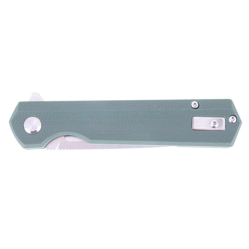 Rukojeť je vyrobena z moderního materiálu G10 (skelný laminát), který je lehký, pevný a odolný vůči vodě i teplotním změnám. Ergonomický tvar zajišťuje pohodlný a jistý úchop bez klouzání. Nůž je dostupný v barevných variantách černá, zelená a modrošedá.