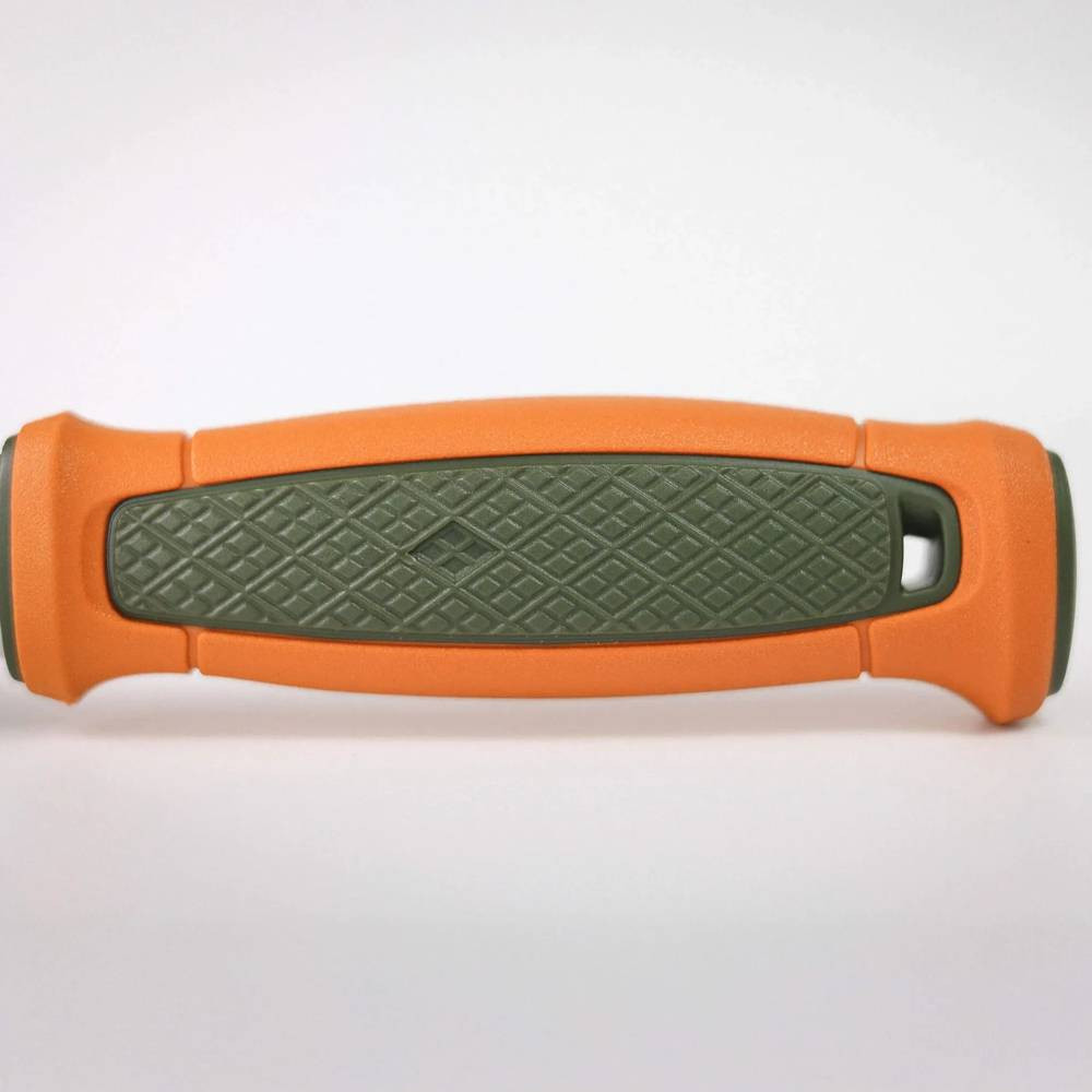 Ergonomicky tvarovaná rukojeť z TPE gumy s měkkým, protiskluzovým povrchem poskytuje jistý úchop i v mokrých či chladných podmínkách. Integrovaná záštita prstů zvyšuje kontrolu a bezpečnost při práci. Tvarovaná polymerová rukojeť v oranžovo-zeleném provedení zajišťuje dobrou viditelnost v terénu a vysoký komfort při používání. Symetrické polymerové pouzdro je vhodné pro praváky i leváky a je doplněno praktickým poutkem z evropské rostlinně činěné kůže.