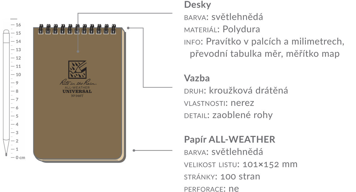 "Rite in the rain" je speciální voděodolný papír vhodný pro používání v jakýchkoliv povětrnostních podmínkách. V africké džungli, v aljašké zimě v potu a špíně irácké pouště, "Rite in the Rain" vždy zaručí, že Vaše poznámky vydrží!