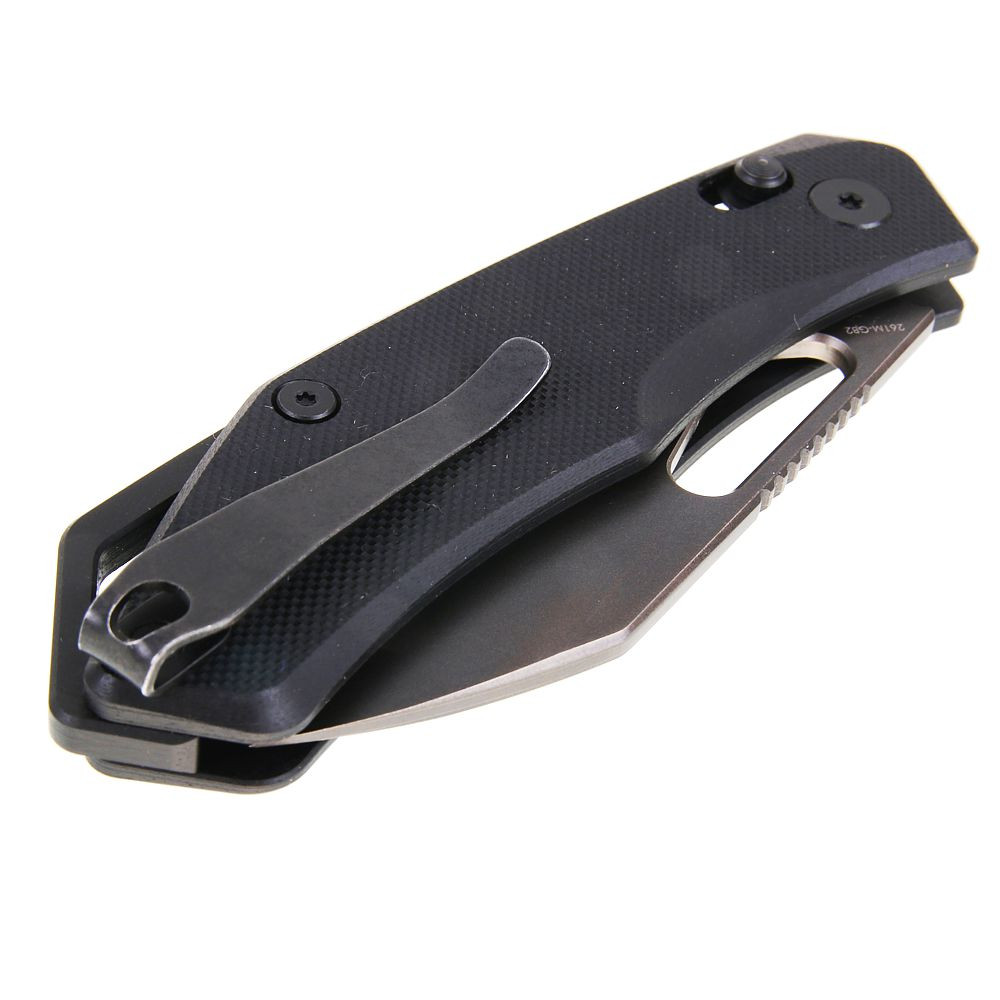 Odolná rukojeť z materiálu G10 poskytuje jistý úchop i v náročných podmínkách a je doplněna o otvor pro šňůrku (lanyard hole) a oboustranný klip pro snadné nošení na obou stranách.