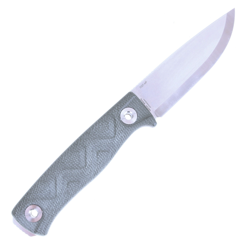 Ergonomická rukojeť z materiálu Micarta nebo G10 zaručuje pevný a neklouzavý úchop, a to i za mokra. Prodloužená patka rukojeti může zároveň sloužit jako malé kladívko – ideální pro všestranné využití v přírodě.