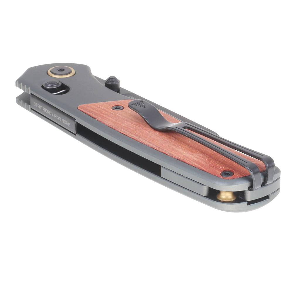 Rukojeť z hliníku v atraktivním olivově zeleném odstínu (AG – Army Green) je lehká, pevná a odolná vůči vlhkosti i teplotním výkyvům a je doplněna dřevěnou vložkou z Palisandru. Díky ergonomickému tvaru a protiskluzové textuře nůž skvěle padne do ruky a poskytuje jistotu i při delším používání.