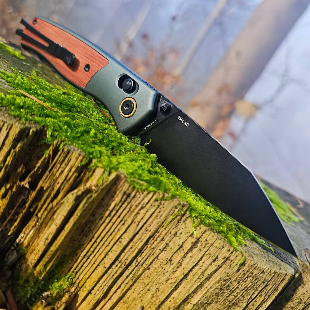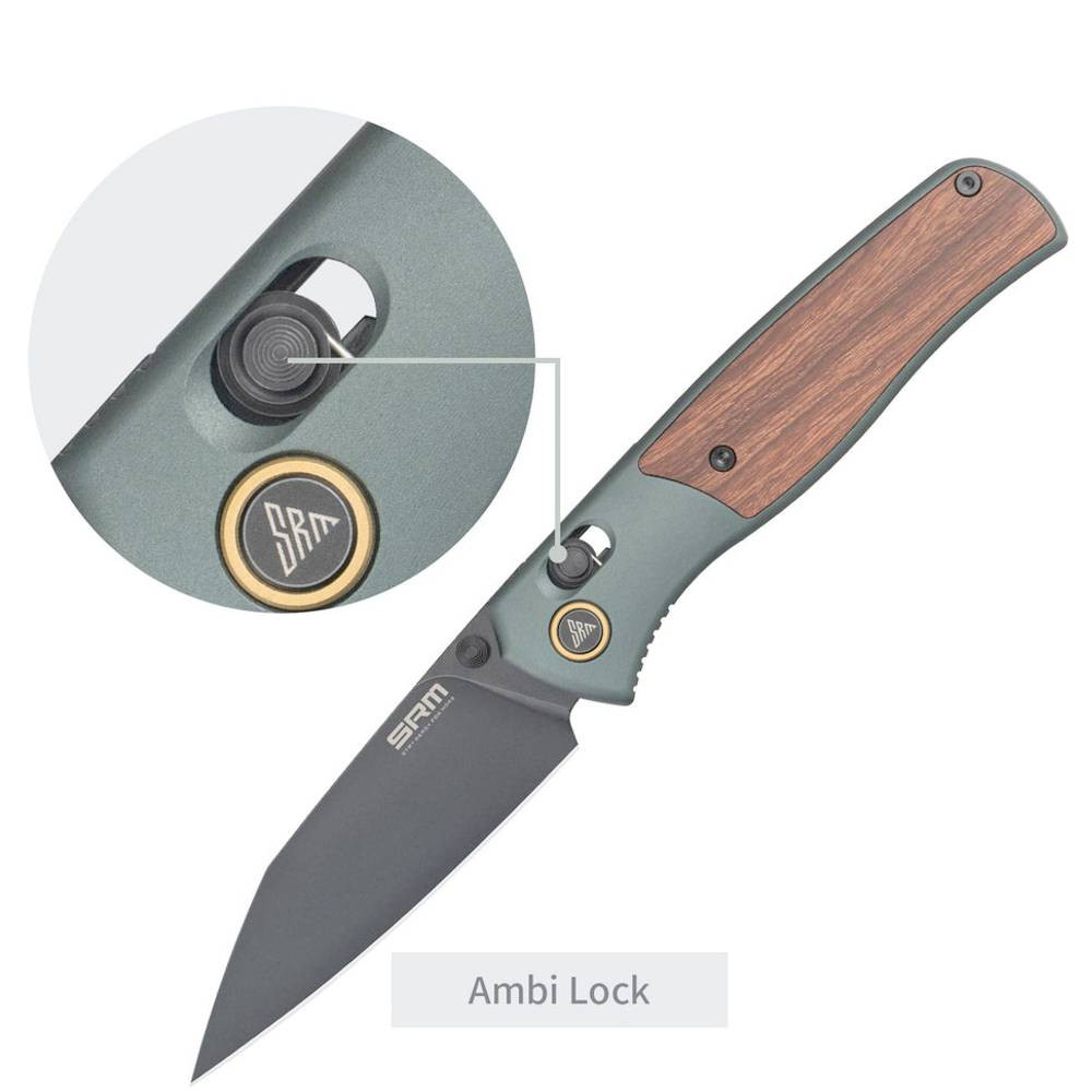 SRM 259L-AG, ocel Sandvik 14C28N, zámek Ambi-Lock, rukojeť zeleně eloxovaný hliník 6063 s vložkami z Palisandru