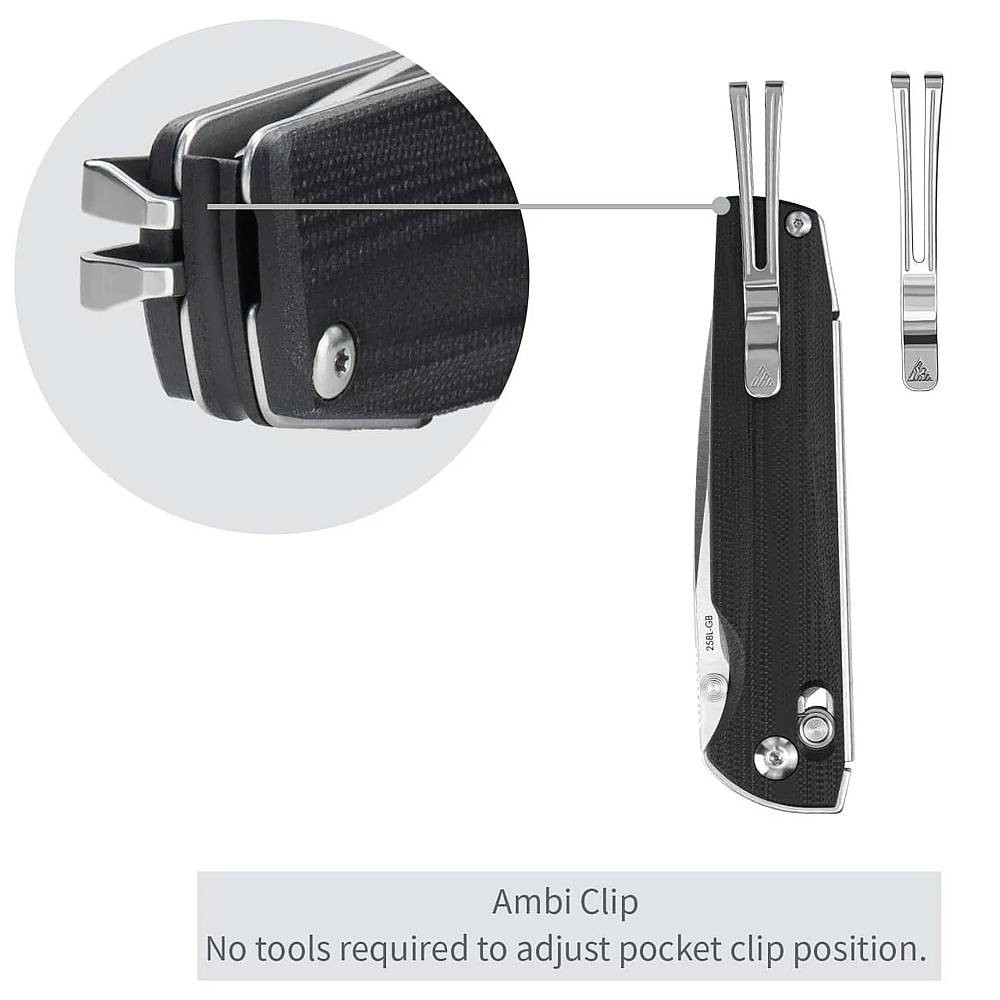 Rukojeť z G10 nebo Micarty přináší jistý úchop, vysokou odolnost vůči vlhkosti a příjemný ergonomický tvar, který dokonale padne do ruky. Vnitřní Mono-Chassis konstrukce zpevňuje tělo nože a spolu s pojistkou Ambi-Lock zajišťuje maximální bezpečnost a spolehlivost i při náročnějším používání.