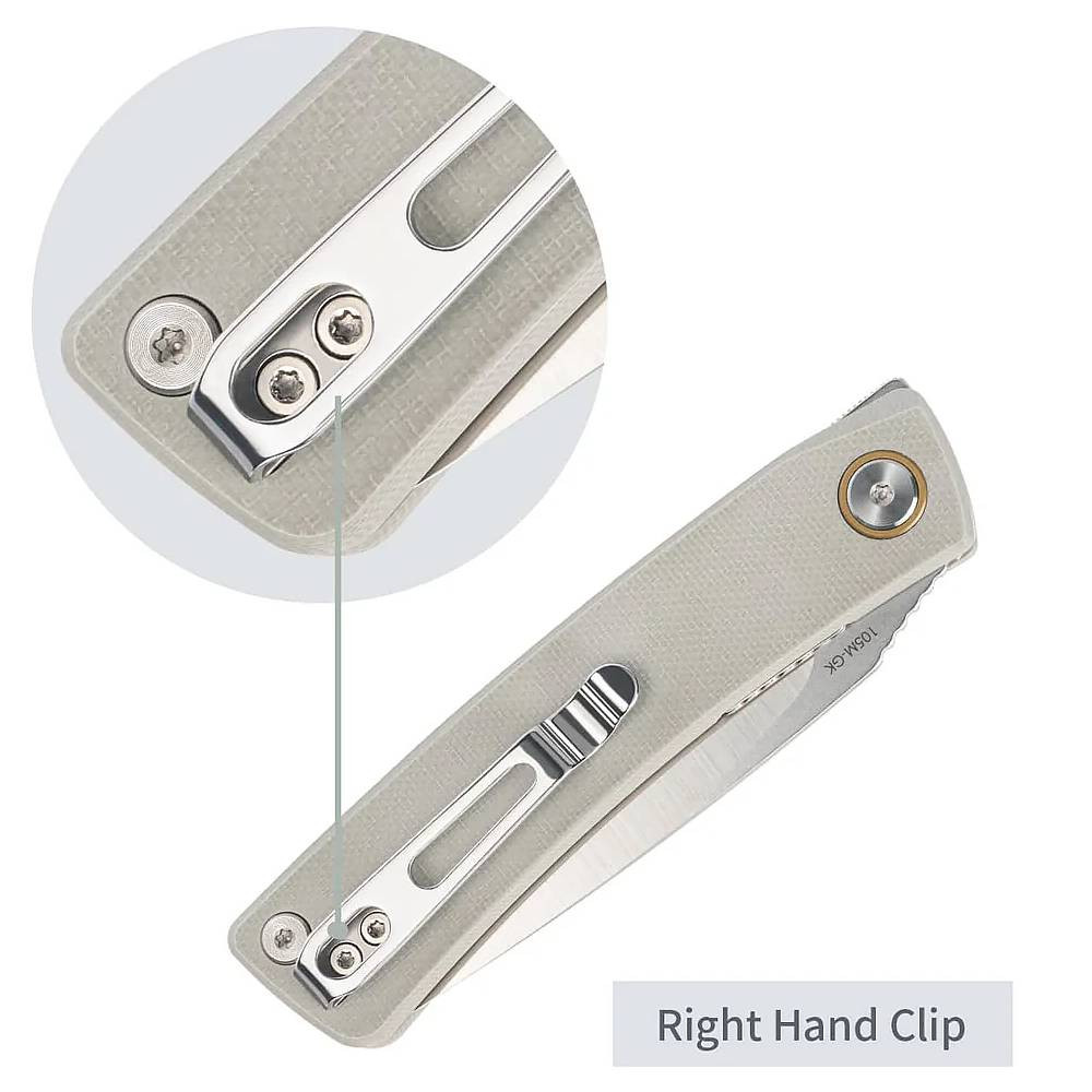 SRM 105M-GK, ocel Sandvik 14C28N, zámek Ambi-Lock, rukojeť z G10, barva světle šedá