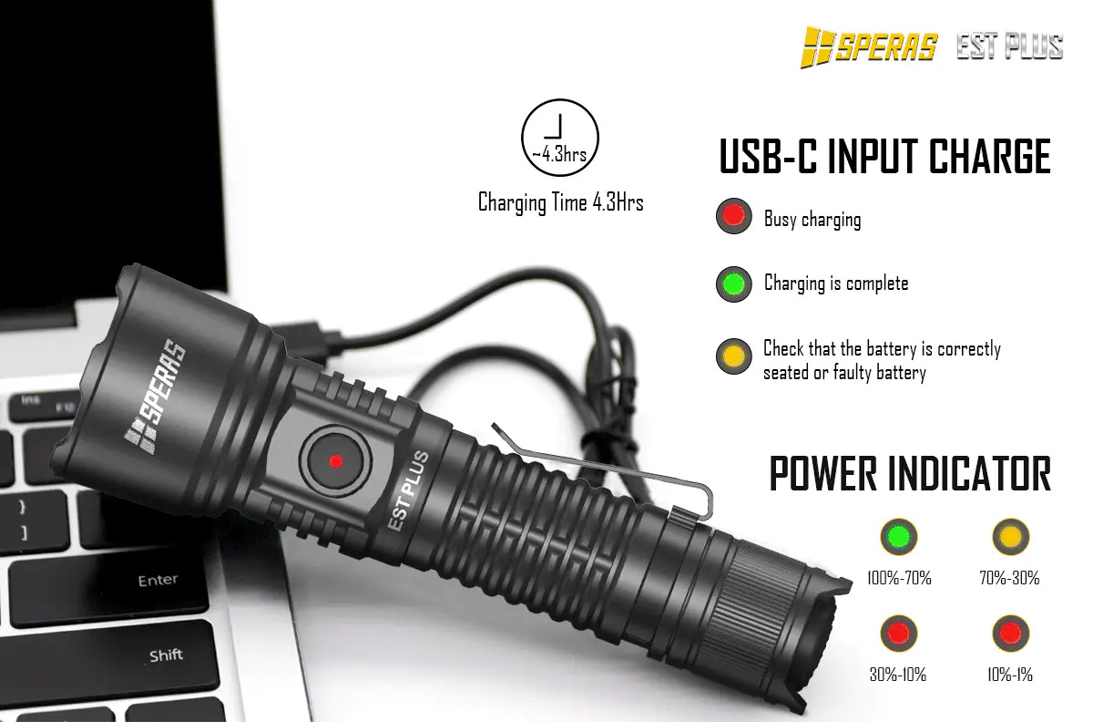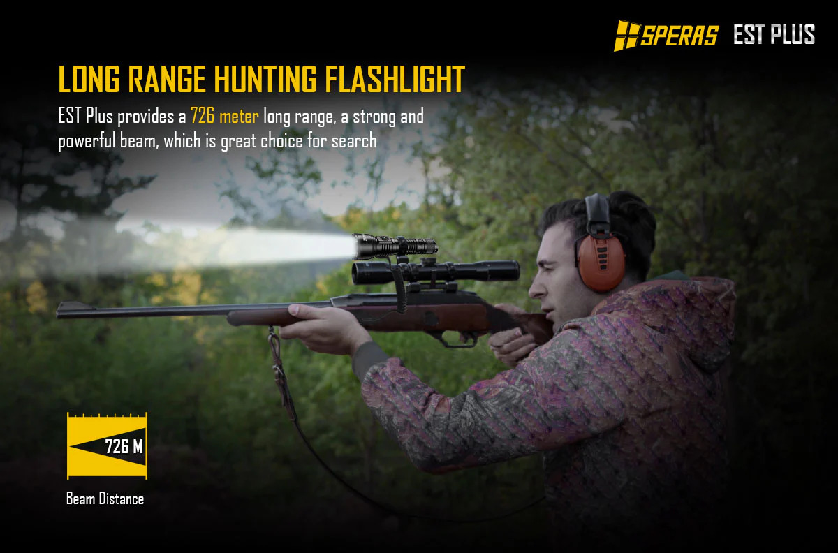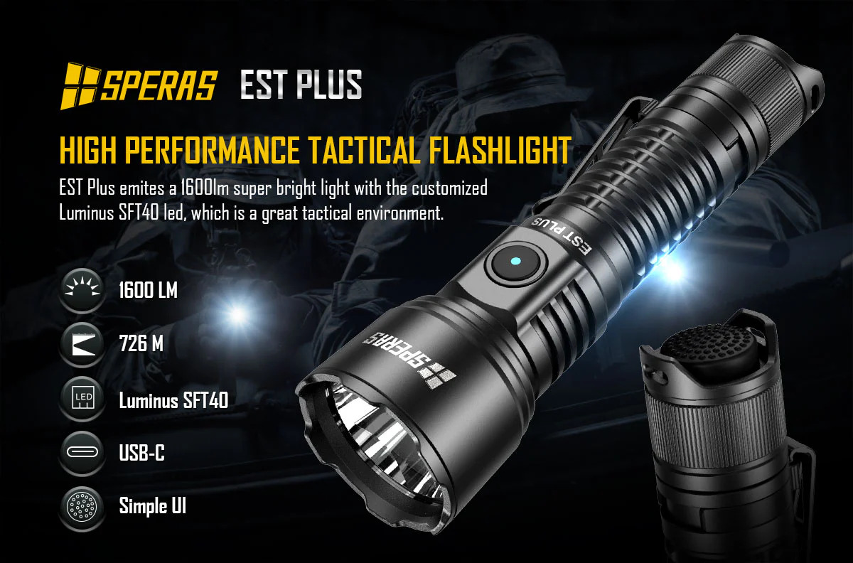 EST PLUS je nová výkonná svítilna, která díky LED Luminus SFT40 a pokročilému ovladači dosahuje maximálního výkonu 1600 lumenů s dosvitem 726 metrů. V návaznosti na klasické vlastnosti svítilny EST je robustní a klasický vzhled svítilny EST PLUS doplněn o uživatelsky velmi přívětivé ovládání se zadním a bočním tlačítkem. Podporuje připojení USB-C pro rychlé nabíjení s dosažením plného nabití za 4,3 hodiny. Je napájena jednou baterií 18650 3800 mAh a poskytuje dlouhou dobu provozu až 140 h. Díky bezkonkurenčnímu výkonu a odolné konstrukci je EST PLUS preferovanou volbou pro lov, pátrání a záchranu, policejní službu, outdoorové aktivity, jako je kempování atd.
