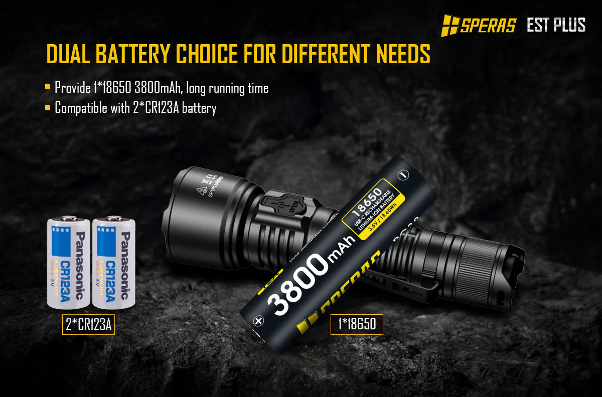 - Kompatibilní s 1 x 18650 lithiovou baterií 3800mAh nebo 2 x CR123A bateriemi