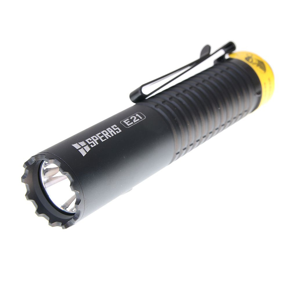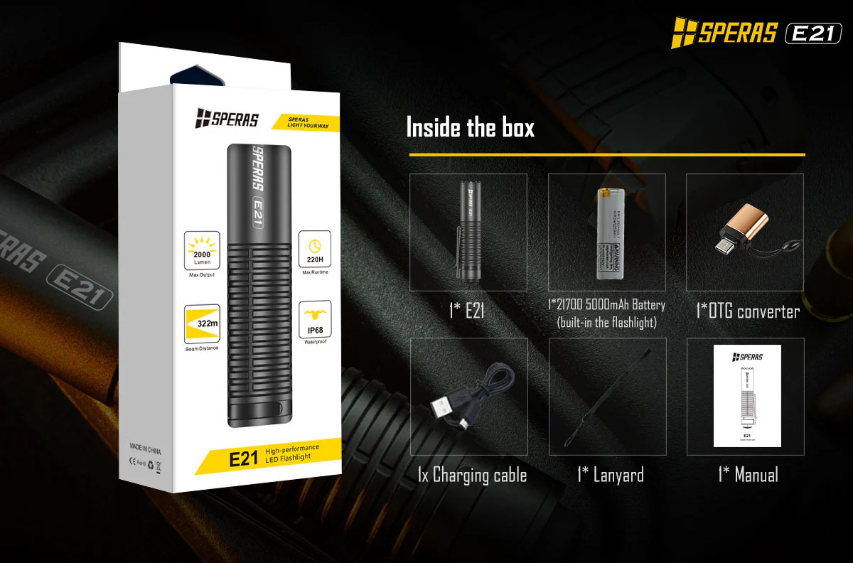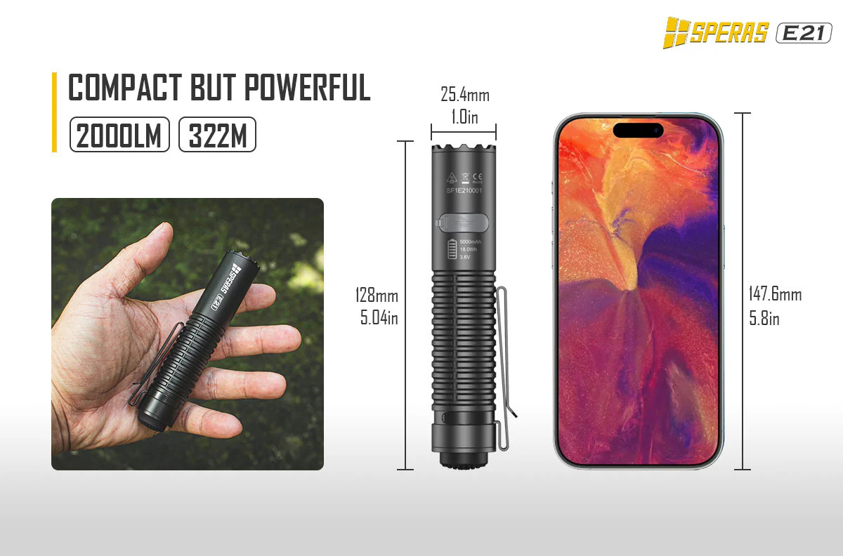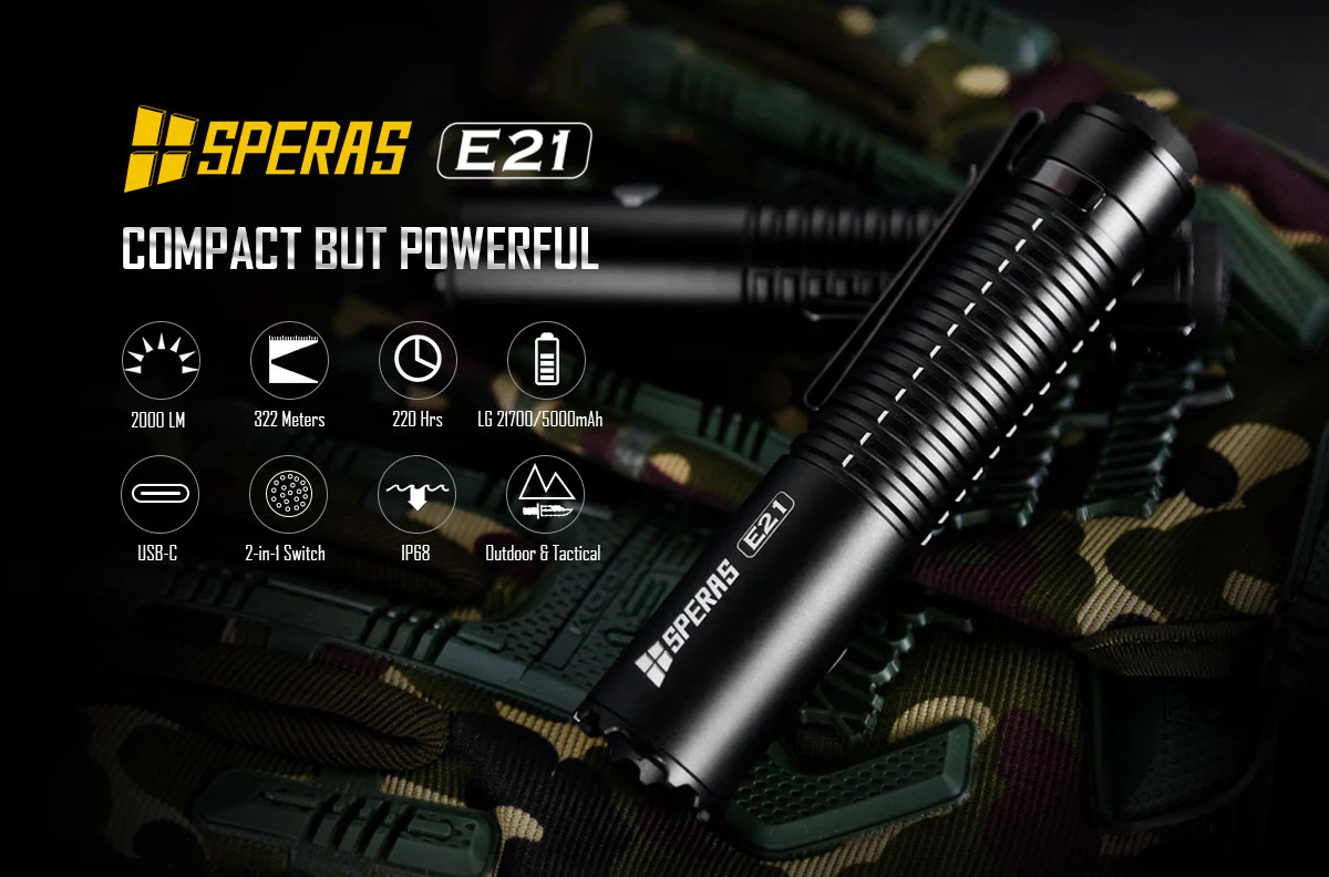 SPERAS E21 je výkonná svítilna s výkonem 2000 lm a dosvitem 322 m. Je vybavena baterií 21700 (5000mAh), má kompaktní rozměry (průměr 1 palec) a to z ní dělá malý, ale dokonalý doplněk v airsoftové nebo vojenské oblasti. Inovativní zadní spínač 2 v 1 poskytuje svítilně 2 možné režimy svícení (outdoor nebo tactical). Každý režim má uživatelsky jednoduché ovládání. Svítilna E21 podporuje rychlé nabíjení a vybíjení 5V/2A (funkce powerbanky). Díky těmto funkcím je E21 ideální svítilnou pro policejní, vojenské, outdoorové nebo každodenní použití apod.