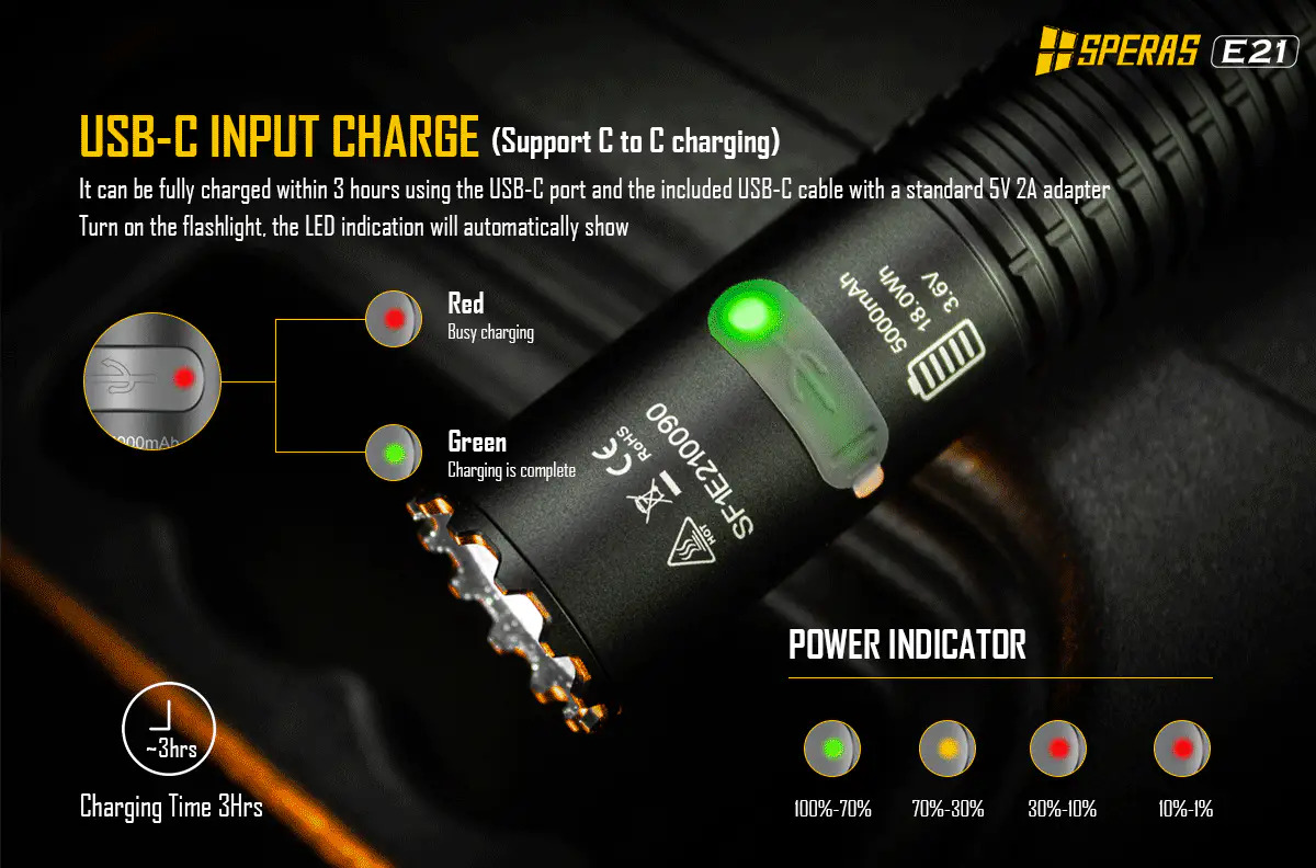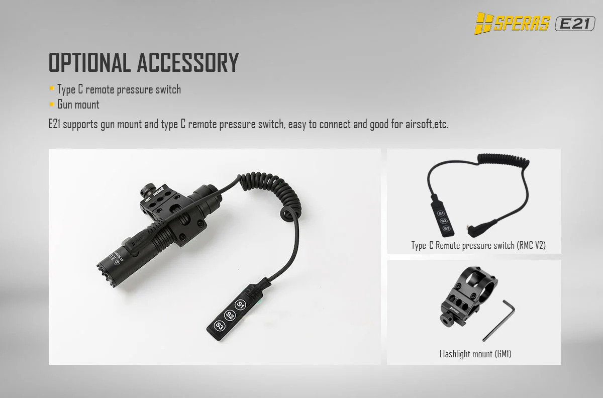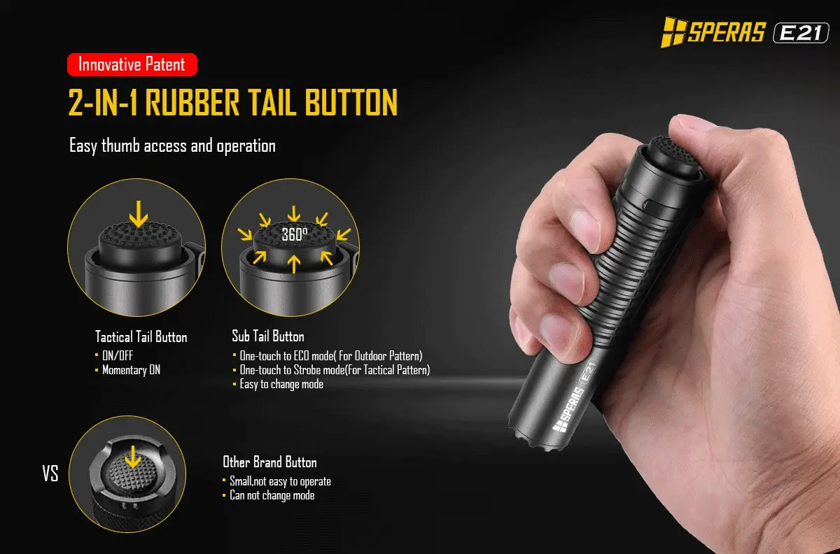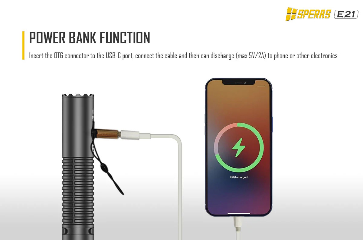 SPERAS E21 je výkonná svítilna s výkonem 2000 lm a dosvitem 322 m. Je vybavena baterií 21700 (5000mAh), má kompaktní rozměry (průměr 1 palec) a to z ní dělá malý, ale dokonalý doplněk v airsoftové nebo vojenské oblasti. Inovativní zadní spínač 2 v 1 poskytuje svítilně 2 možné režimy svícení (outdoor nebo tactical). Každý režim má uživatelsky jednoduché ovládání. Svítilna E21 podporuje rychlé nabíjení a vybíjení 5V/2A (funkce powerbanky). Díky těmto funkcím je E21 ideální svítilnou pro policejní, vojenské, outdoorové nebo každodenní použití apod.