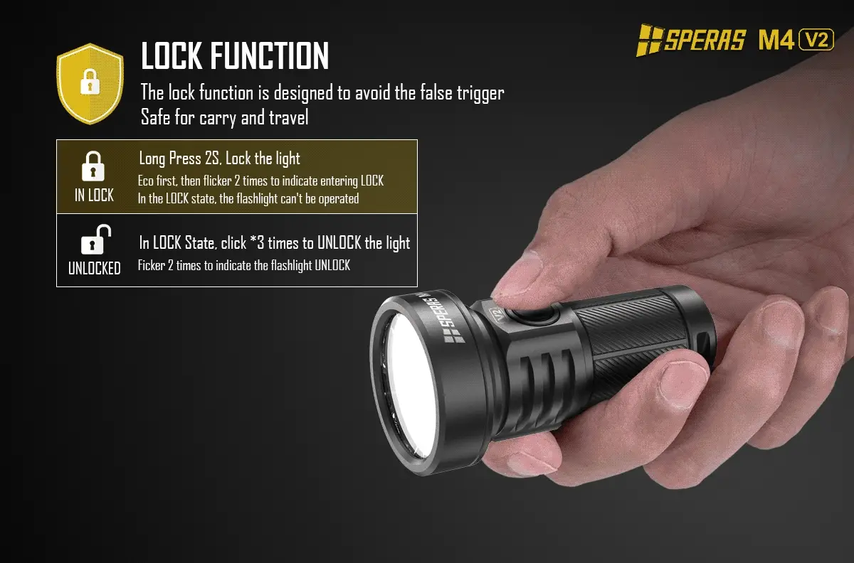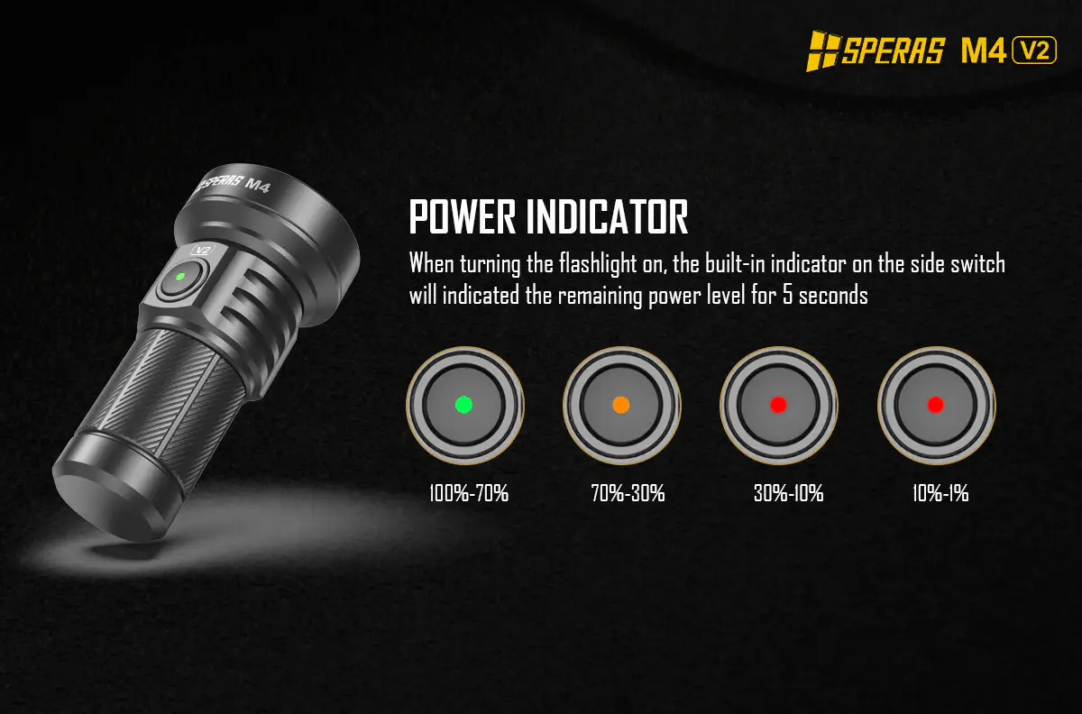 Svítilna SPERAS M4 byla nově vylepšena a využívá pokročilou vysoce výkonnou diodu LED Luminus SFT40, která vydává jasné světlo o síle až 2000 lumenů a maximální vzdálenost dosahuje až 700 m. Nabízí 7 různých režimů svícení: Turbo, Vysoký, Střední, Nízký výkon, Stroboskop a SOS režim, s působivou dobou provozu (až 220 hodin v ECO režimu). Díky uživatelsky přívětivému ovládání a paměťové funkci se jedná o ideální svítilnu pro každodenní použití, kempování apod.