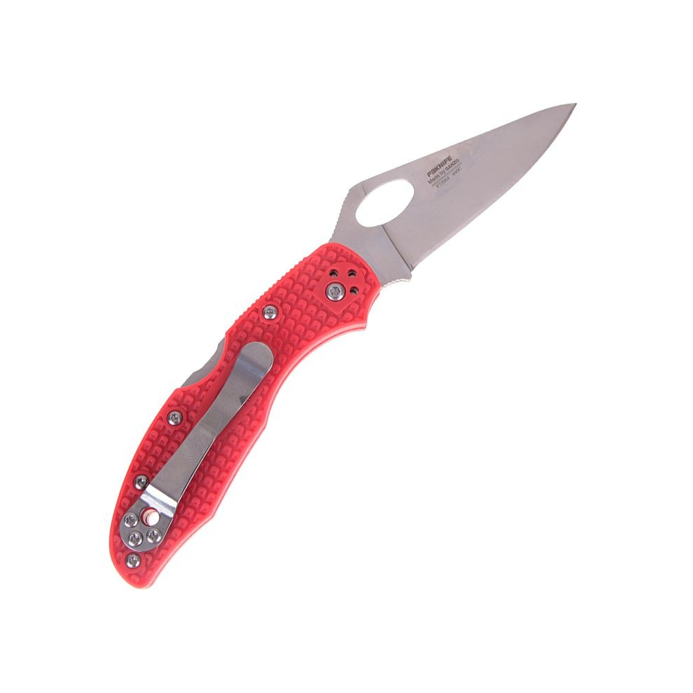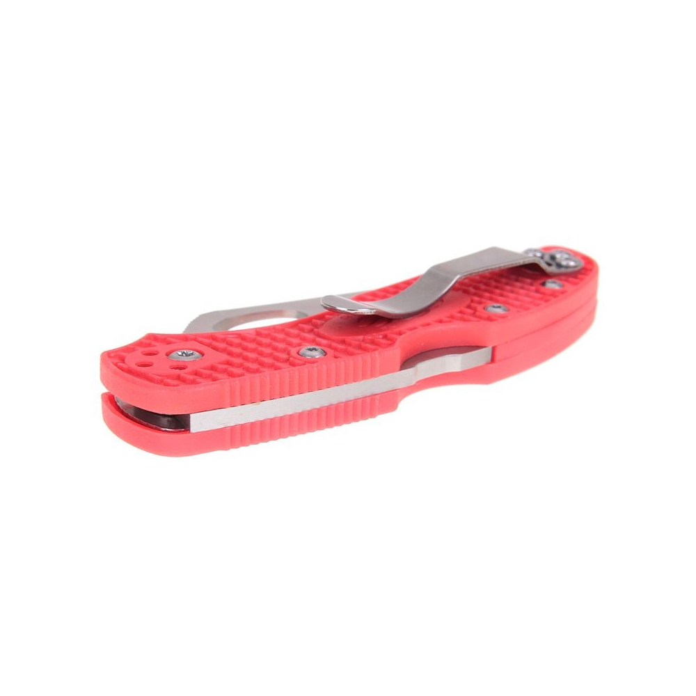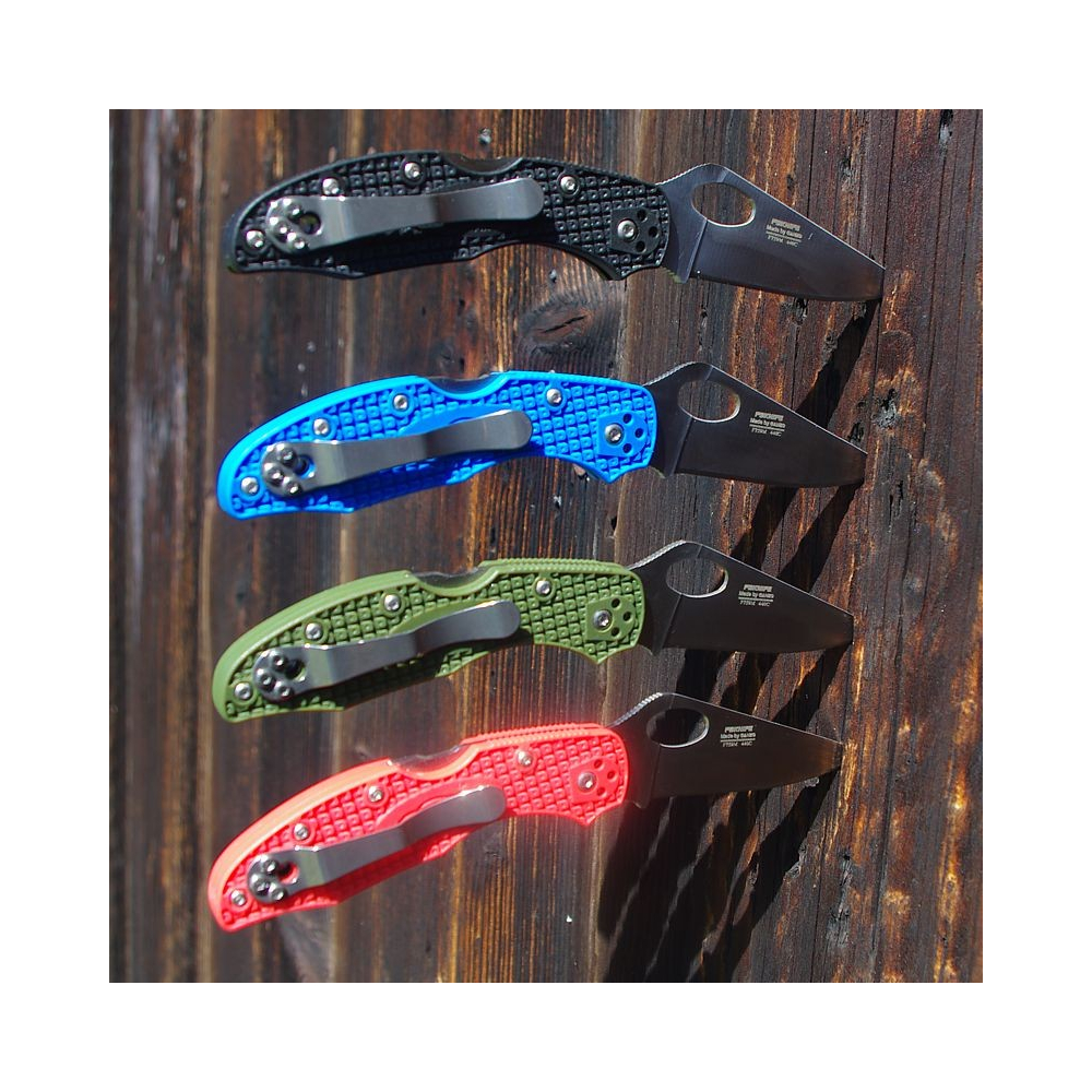 Der Griff besteht aus robustem G10, das sich durch geringes Gewicht und hohe Festigkeit auszeichnet. Die Griffschalen sind mit fünf Schrauben befestigt, während der Metall-Taschenclip mit weiteren drei Schrauben montiert ist. Der Clip lässt sich in vier verschiedenen Positionen anbringen, was ein bequemes Tragen nach den Vorlieben des Nutzers ermöglicht. Das Messer ist in mehreren Griff-Farbvarianten erhältlich: schwarz, orange, rosa und blau.