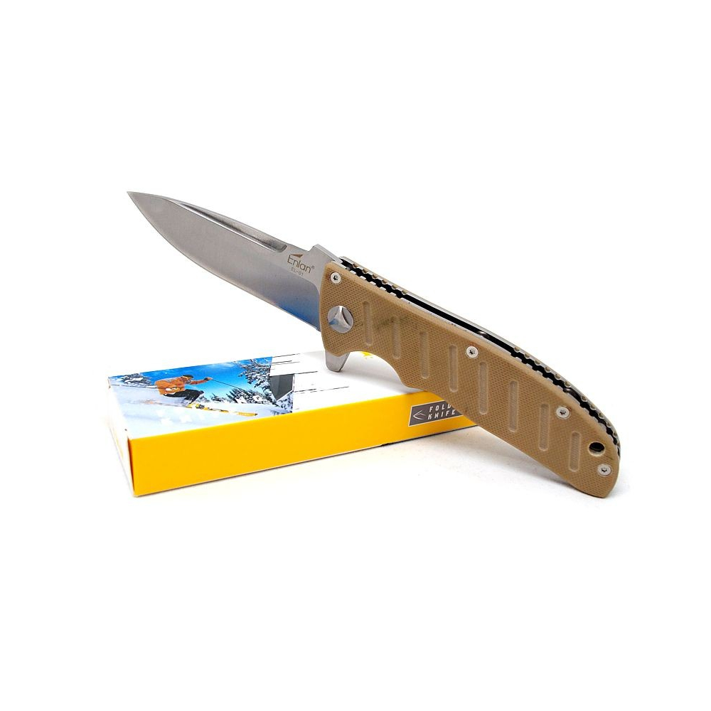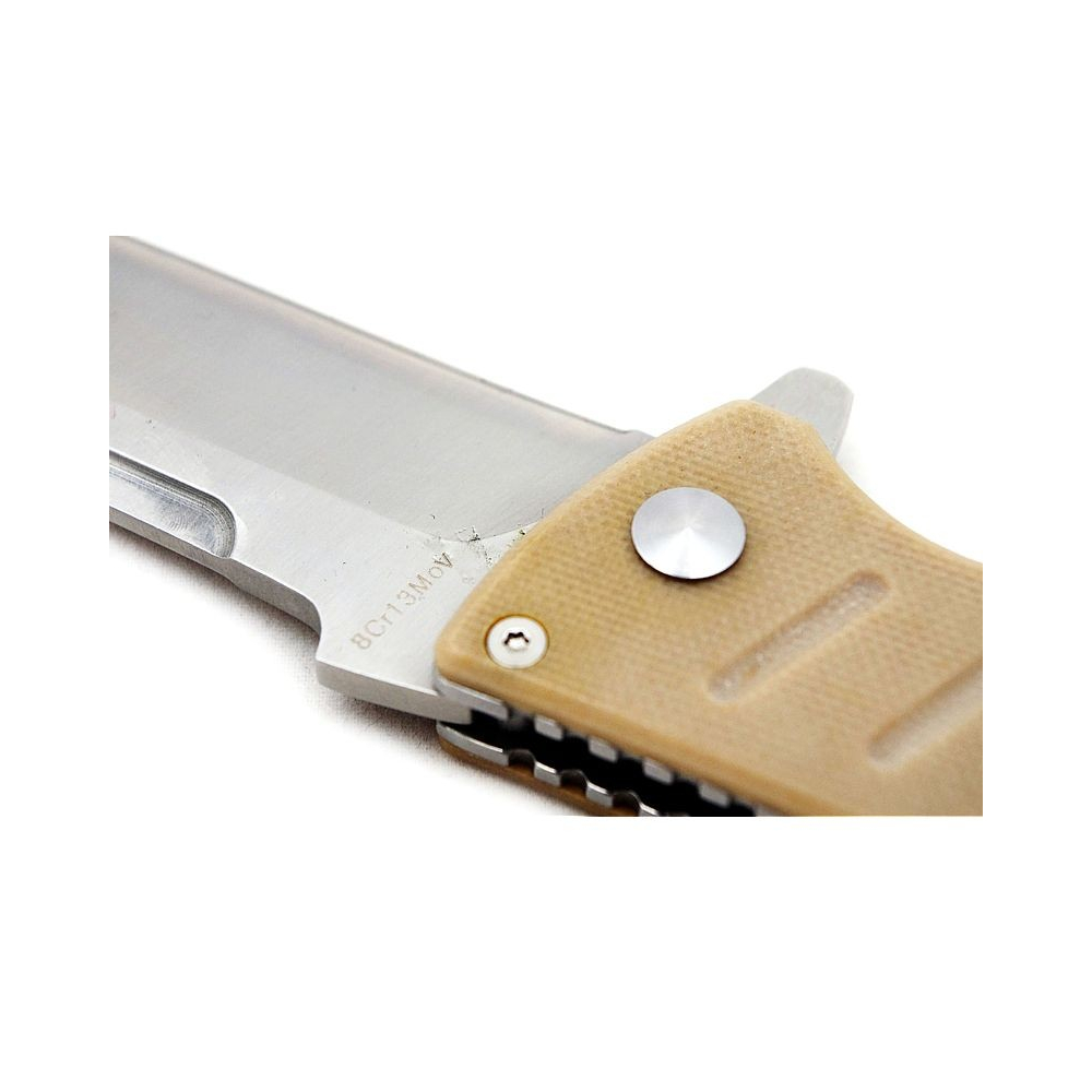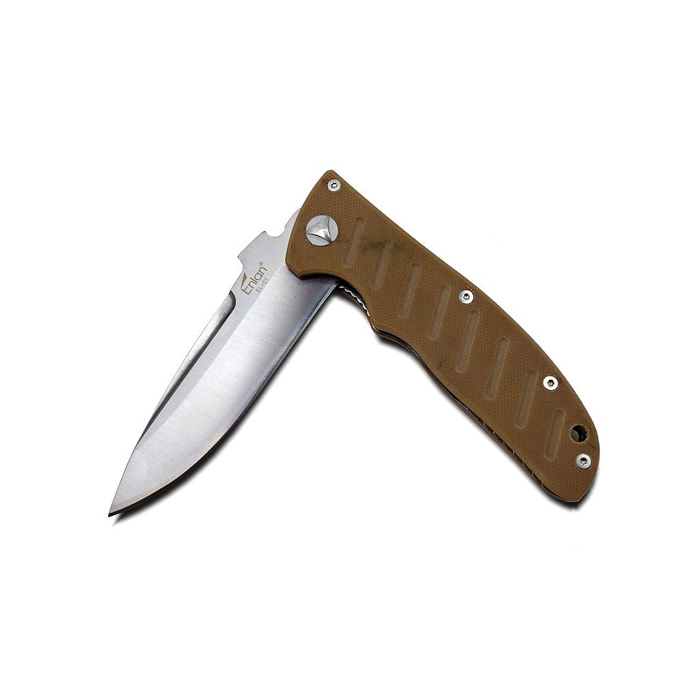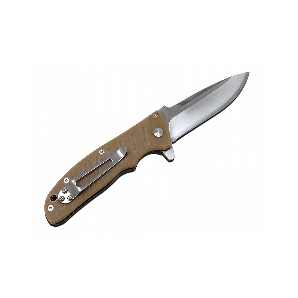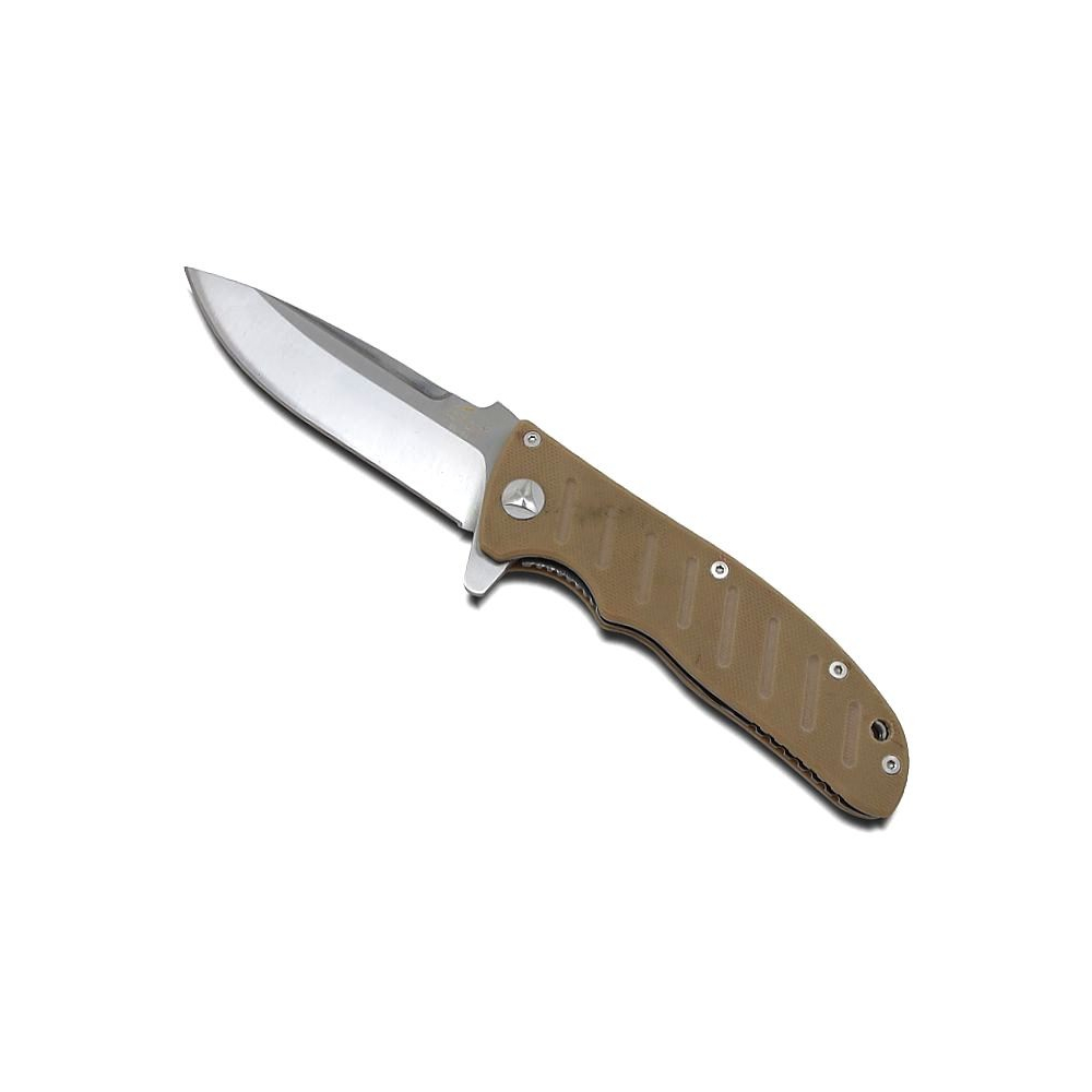 Robustes, vollwertiges Messer, dessen Klinge mit einer Hand über einen Flipper geöffnet werden kann. Die Klinge dieses Messers ist daher nicht mit einem traditionellen Öffnungsstift ausgestattet, sondern wird im geöffneten Zustand durch einen Liner-Lock-Verschluss gesichert, die Klinge ist aus G-10 Material in der Farbe Khaki gefertigt.