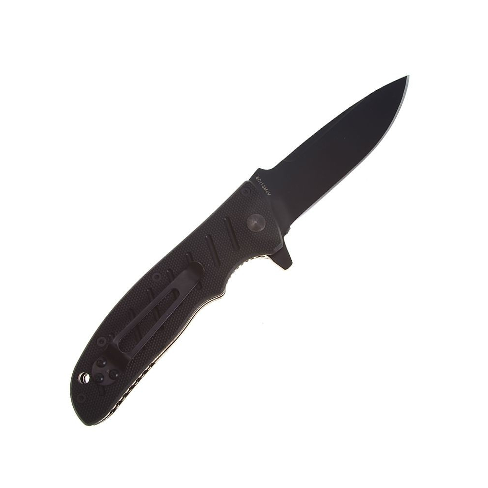 Robustes, vollwertiges Messer in der Ausführung "black", dessen Klinge mit dem sogenannten Flipper einhändig geöffnet werden kann. Die Klinge dieses Messers ist daher nicht mit einem traditionellen Öffnungsstift ausgestattet, sie wird im geöffneten Zustand durch eine Liner-Lock-Sicherung gesichert, die Klinge ist aus G-10 Material gefertigt.