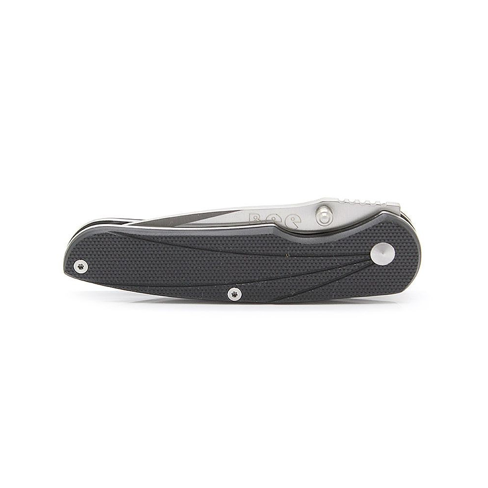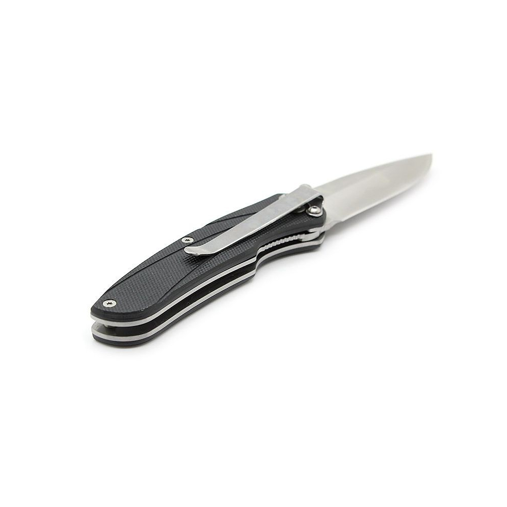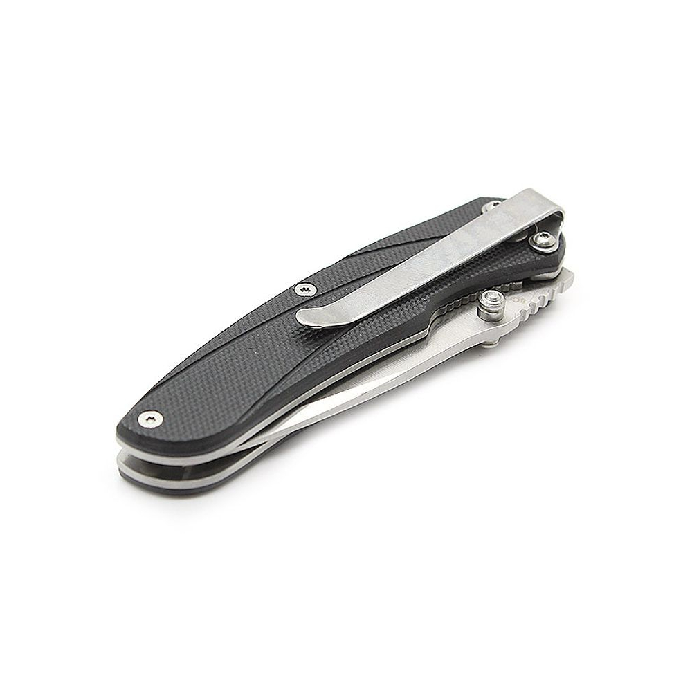 Ein sehr handliches Messer mit einfachen, schlichten Formen, mit einer Drop-Point-Klinge aus 8Cr13Mov, hohlgeschliffen, beidseitig gestiftet und mit einem starren Liner-Lock gesichert. Die Klingen sind aus G10-Material gefertigt, aufgeraut mit feinem Fischgrätenmuster. Der Clip ist wieder zuverlässig starr mit einer Tip-Down-Tragekonfiguration.