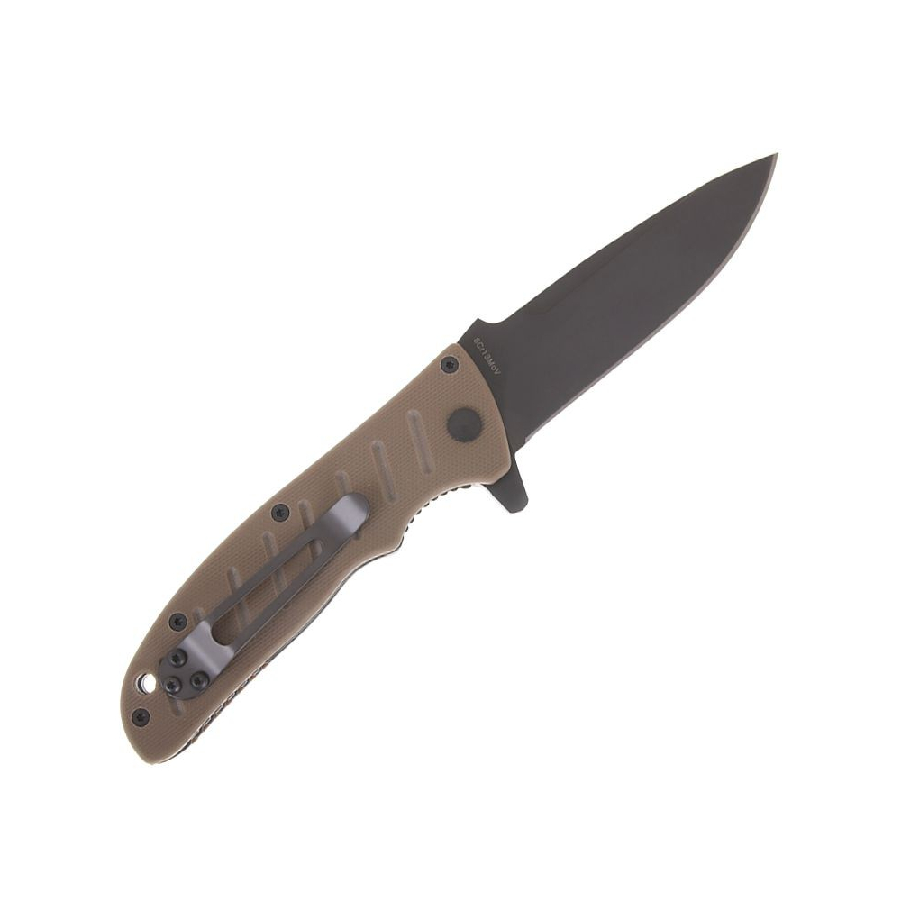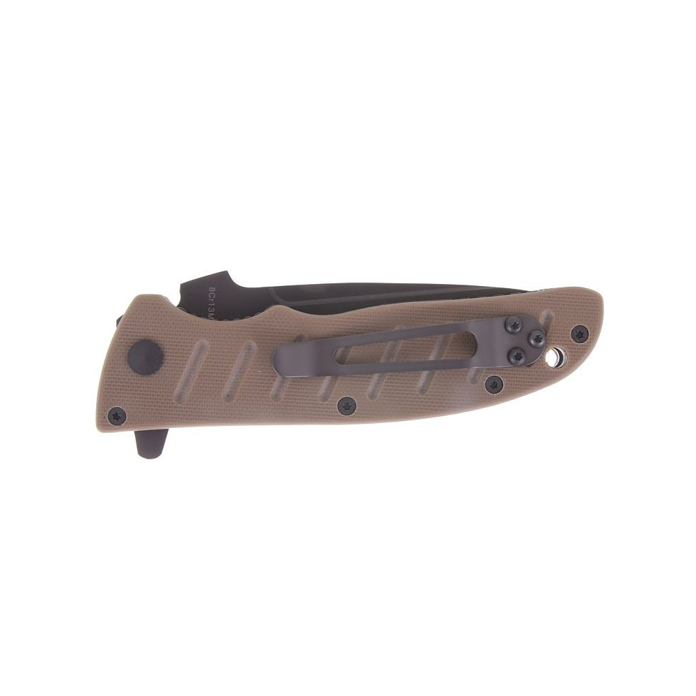 Robustes, vollwertiges Messer, dessen Klinge mit einer Hand über einen Flipper geöffnet werden kann. Die Klinge dieses Messers ist daher nicht mit einem traditionellen Öffnungsstift ausgestattet, sie wird im geöffneten Zustand durch eine Liner-Lock-Sicherung gesichert, die Klinge ist aus G-10 Material in gelber Farbe gefertigt.
