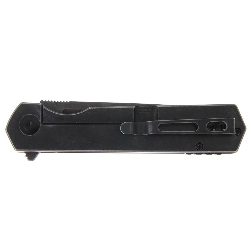 Der Griff besteht aus rostfreiem Stahl mit erhöhter Korrosionsbeständigkeit, was dieses Messer zu einem idealen Begleiter für Outdoor-Aktivitäten wie Angeln, Jagd oder Wandern macht. Die Oberflächenbehandlung des Griffs entspricht der der Klinge und sorgt für ein einheitliches, elegantes Erscheinungsbild. Auf einer Seite befindet sich ein praktischer Taschenclip für bequemes Tragen.