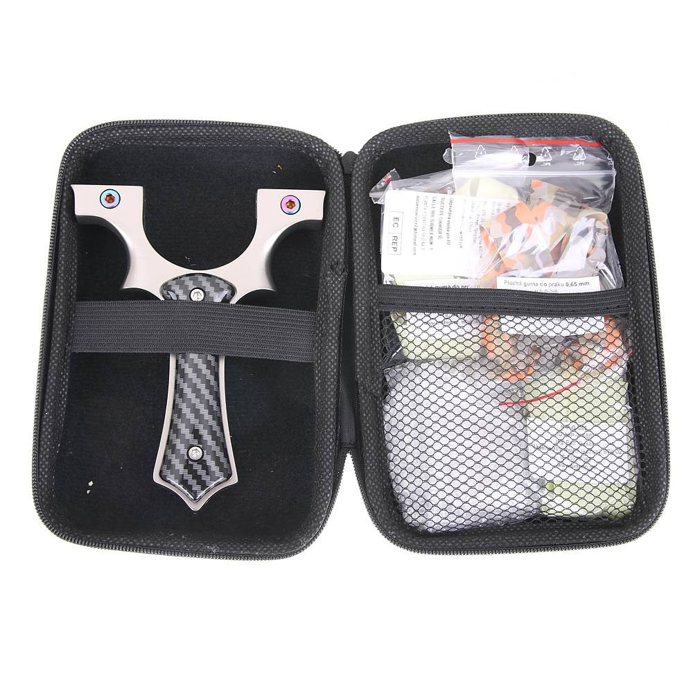 Das Schleuderpaket enthält die Schleuder selbst und einen Inbusschlüssel für die Montage der Gummis. Weiterhin enthält das Paket je ein Stück 20/12 Gummi in den Stärken 0,55, 0,65 und 0,75 mm und eine Tragetasche zur einfachen Aufbewahrung und zum Transport.