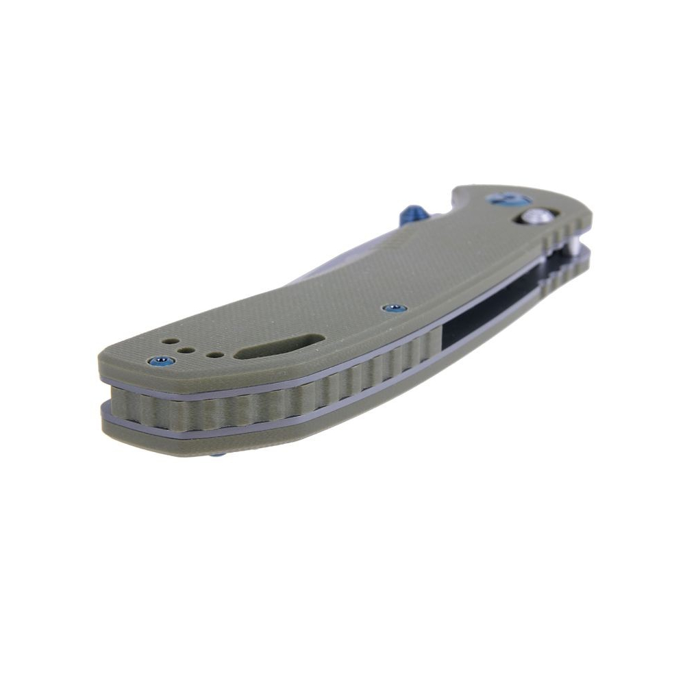Der Griff des F7533 ist aus G10-Material gefertigt. Dieser Verbundwerkstoff ist stabil und leicht, korrosionsbeständig und unempfindlich gegenüber natürlichen Einflüssen wie Wasser, Wind oder Sonne. Die beiden Laschen werden von drei Schrauben auf einem Stahlsockel gehalten. Am Ende des Griffs befindet sich ein kleines Loch zum Einfädeln von z.B. Paracord.