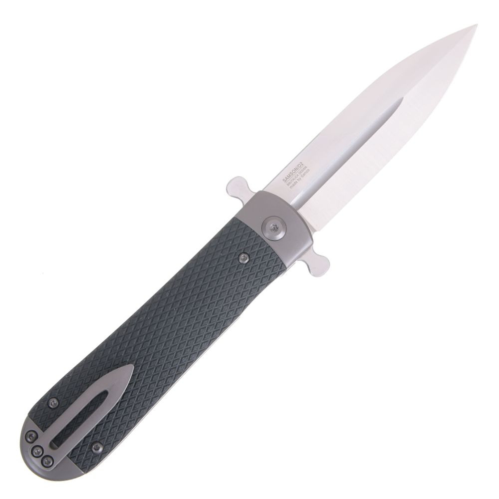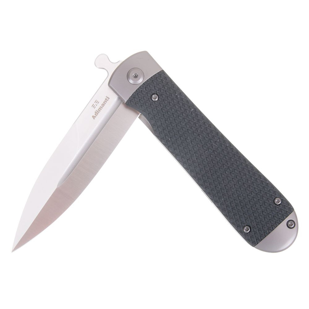 Adimanti Samson ist ein kompakter Flipper, dessen Klinge sowohl in geöffneter als auch in geschlossener Position sicher arretiert wird. Der Griff verfügt über einen stabilen Stahlrahmen mit zwei strukturierten G10-Griffschalen. Dieses robuste Verbundmaterial zeichnet sich durch hohe Schlagfestigkeit, Beständigkeit gegen Kälte und UV-Strahlung aus, liegt rutschfest in der Hand und behält langfristig sein Aussehen.