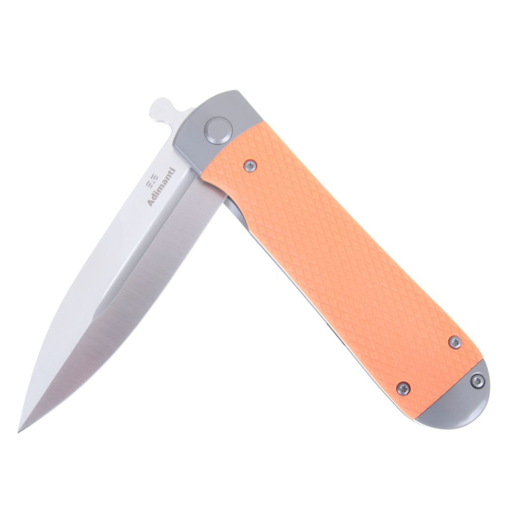 Adimanti Samson ist ein kompakter Flipper, dessen Klinge sowohl in geöffneter als auch in geschlossener Position sicher arretiert wird. Der Griff verfügt über einen stabilen Stahlrahmen mit zwei strukturierten G10-Griffschalen. Dieses robuste Verbundmaterial zeichnet sich durch hohe Schlagfestigkeit, Beständigkeit gegen Kälte und UV-Strahlung aus, liegt rutschfest in der Hand und behält langfristig sein Aussehen.