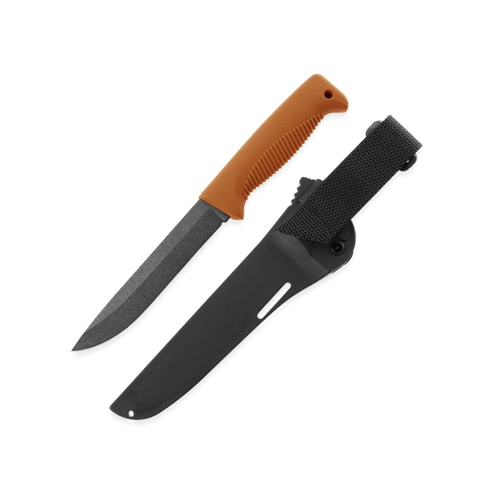 Das Ranger-Messer wurde von J-P Peltonen, Hauptmann der finnischen Verteidigungsstreitkräfte, entworfen. Klinge aus Kohlenstoffstahl mit Teflon-Beschichtung, Griff aus Thermoflex-Polymer, Kunststoffscheide.