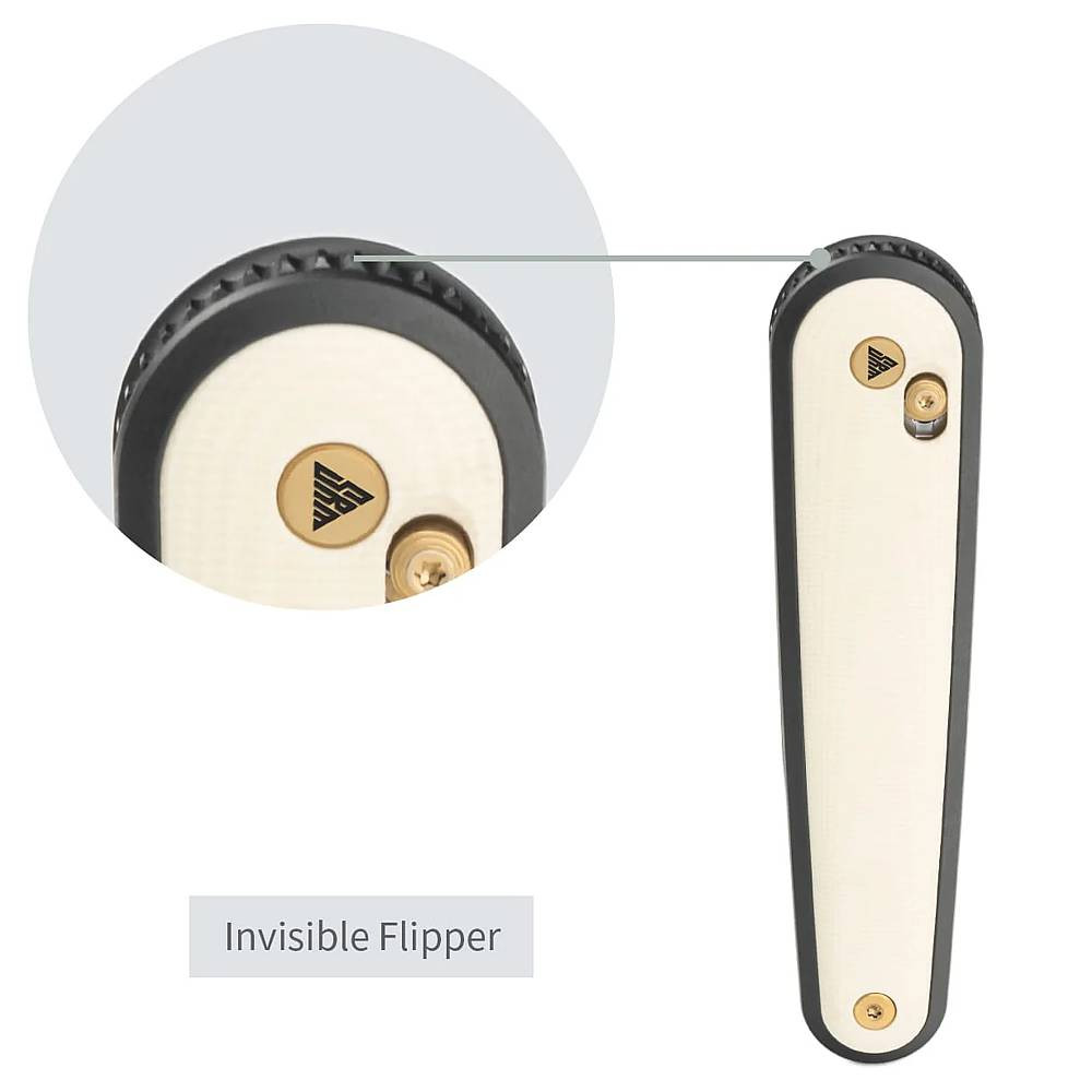 Die Spear Point Klinge ist aus hochwertigem N690 Stahl (58-60 HRC) mit Titanbeschichtung gefertigt, die seine Korrosions- und Verschleißfestigkeit erhöht. Das reibungslose Öffnen wird durch einen Keramik-Kugellagerstift gewährleistet, der das Messer einfach und schnell mit einer Hand öffnen lässt.