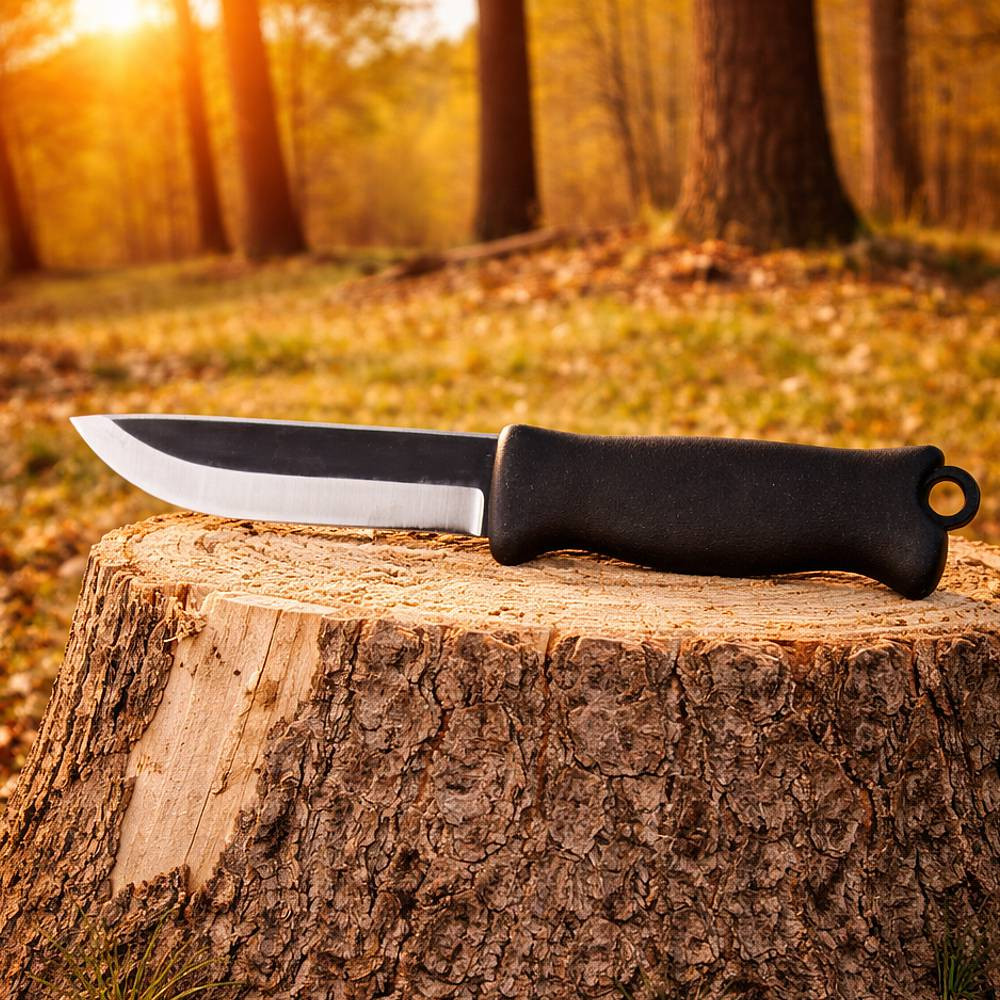 Robustes finnisches Bushcraft-Messer aus 80CrV2-Stahl mit Full-Tang-Konstruktion, Scandi-Schliff und gummiertem Griff. Ideal für Outdoor, Survival, Holzspalten und den täglichen Einsatz.