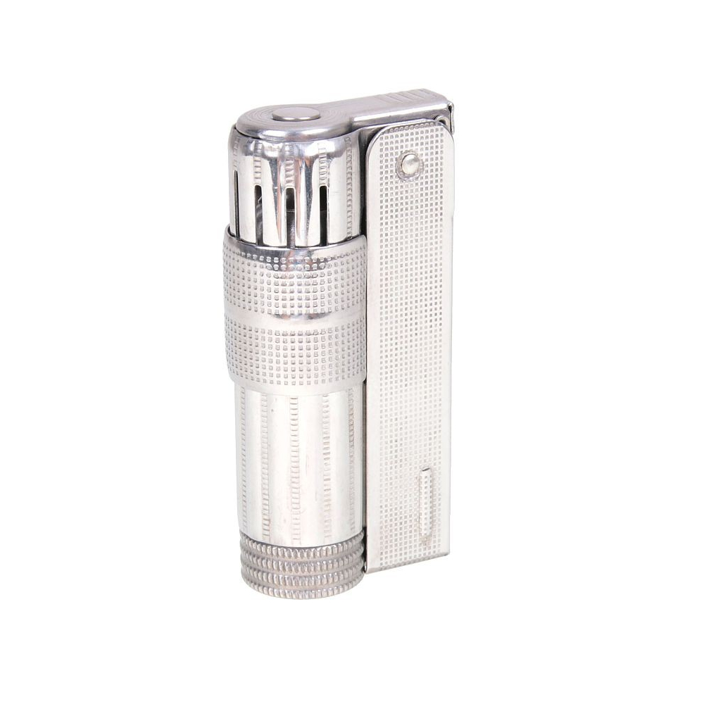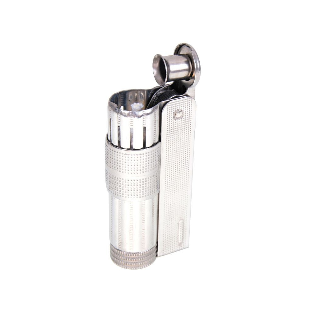 The design of this lighter is known from the First World War, it is an all-metal gasoline, flint lighter with a textured surface and a control ring (you regulate the amount of air to the flame). Pressing and flipping the top cover of the lighter pinches the flint to ignite the flame. Refuel by sliding out a reservoir of gasoline soaked in cotton wool in the lighter.