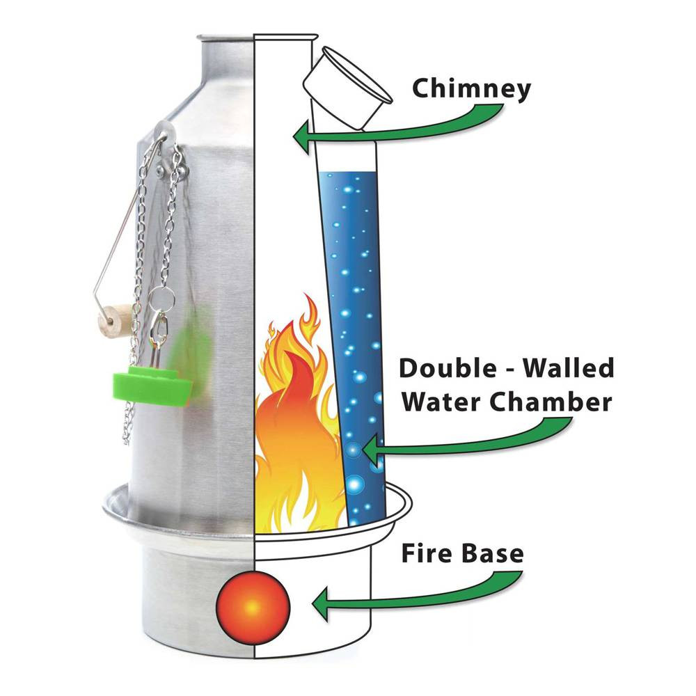 Warning: The kettle is designed to boil water extremely quickly in all weather conditions while using very little fuel. When the Kelly Kettle is filled with water, it should always be carried upright to avoid spillage or leakage from the spout or chimney top.