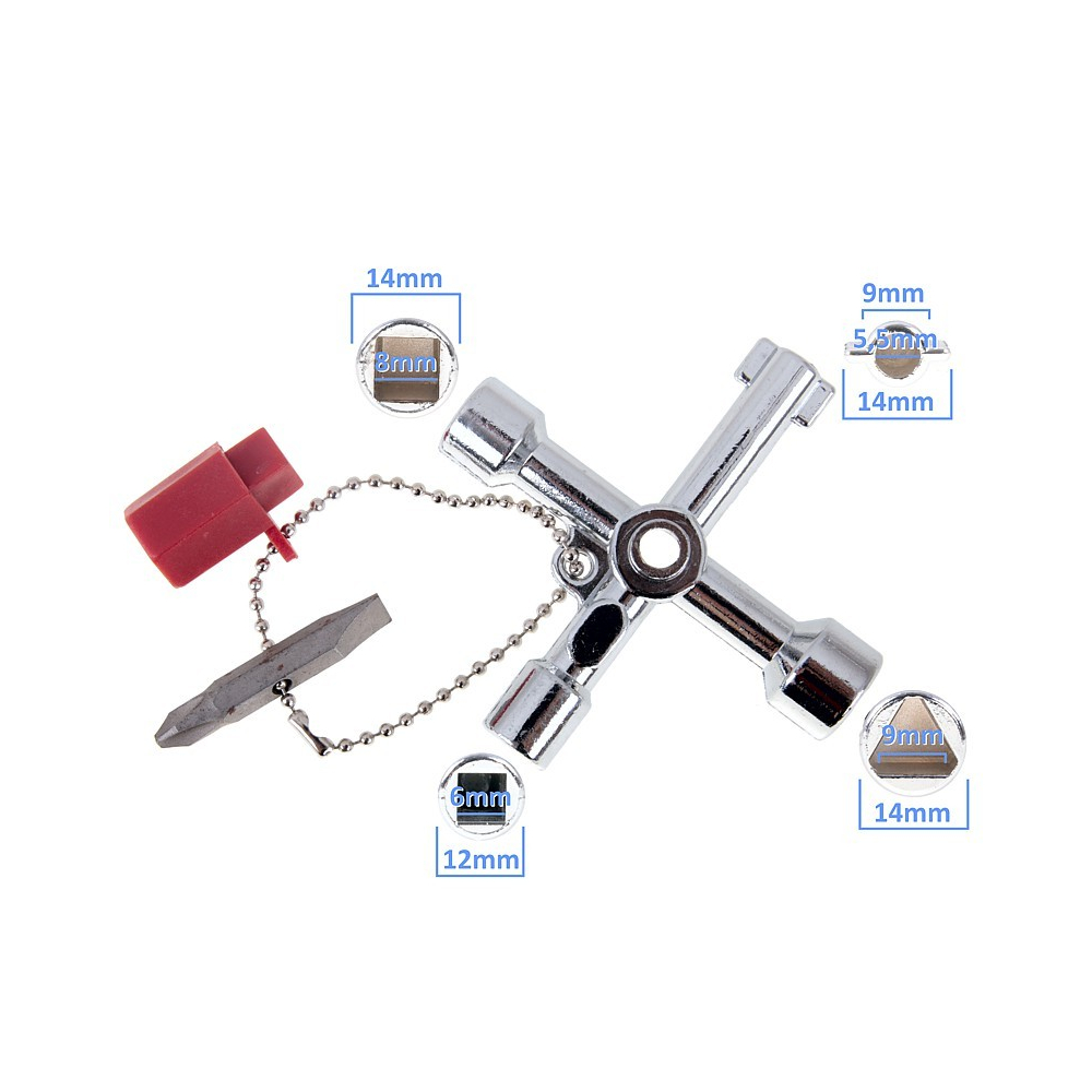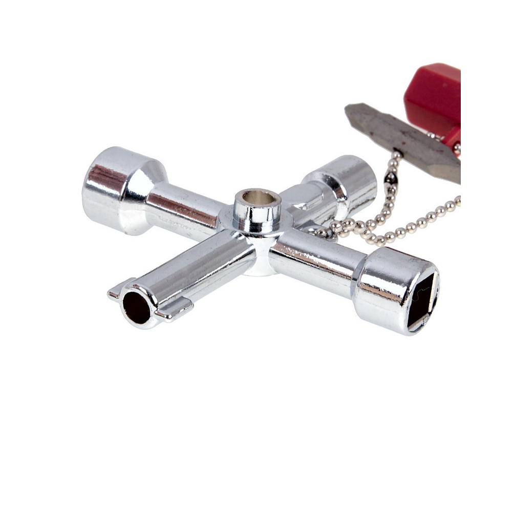 Universal wrench for plumbers, electricians, technicians or emergency workers. Includes 4 wrenches that fit common cabinet locks.