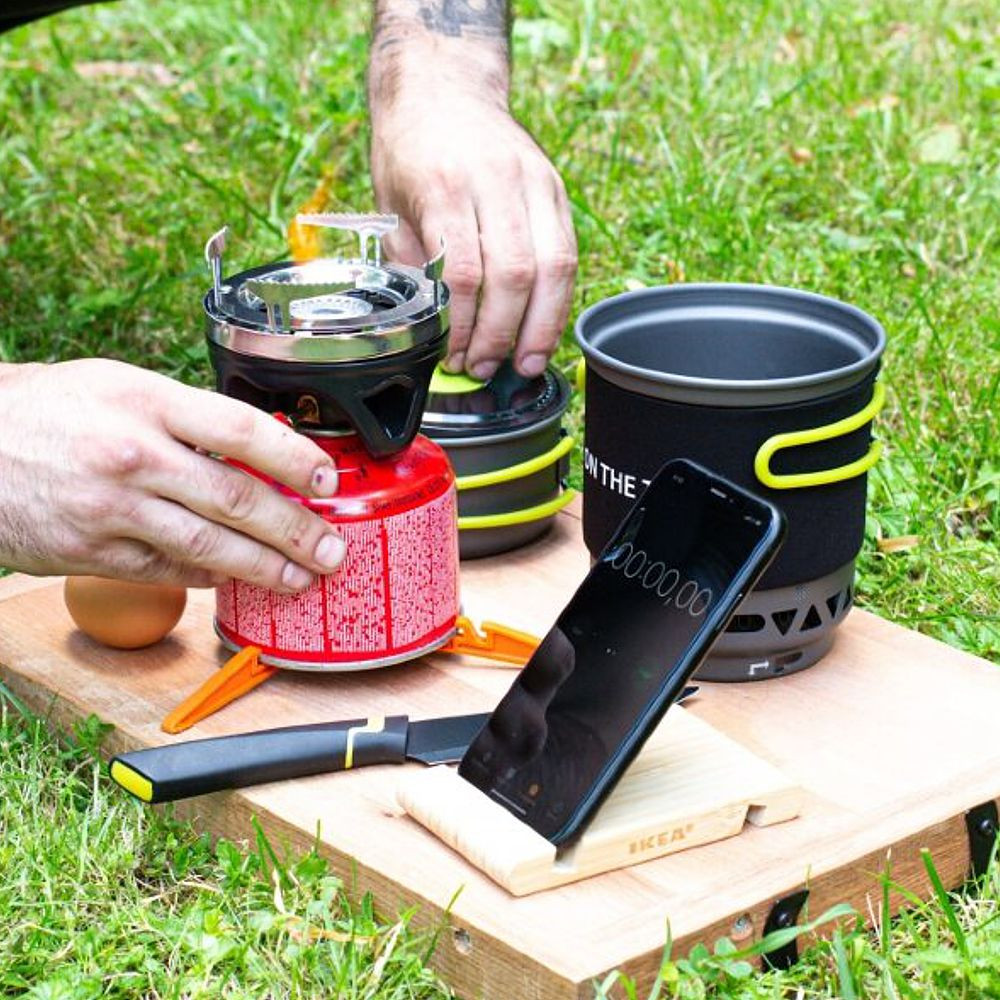 The set is made from lightweight anodized aluminum. The larger pot has a heat-insulating sleeve, while the smaller one features a silicone anti-burn handle. The burner includes built-in piezo ignition.