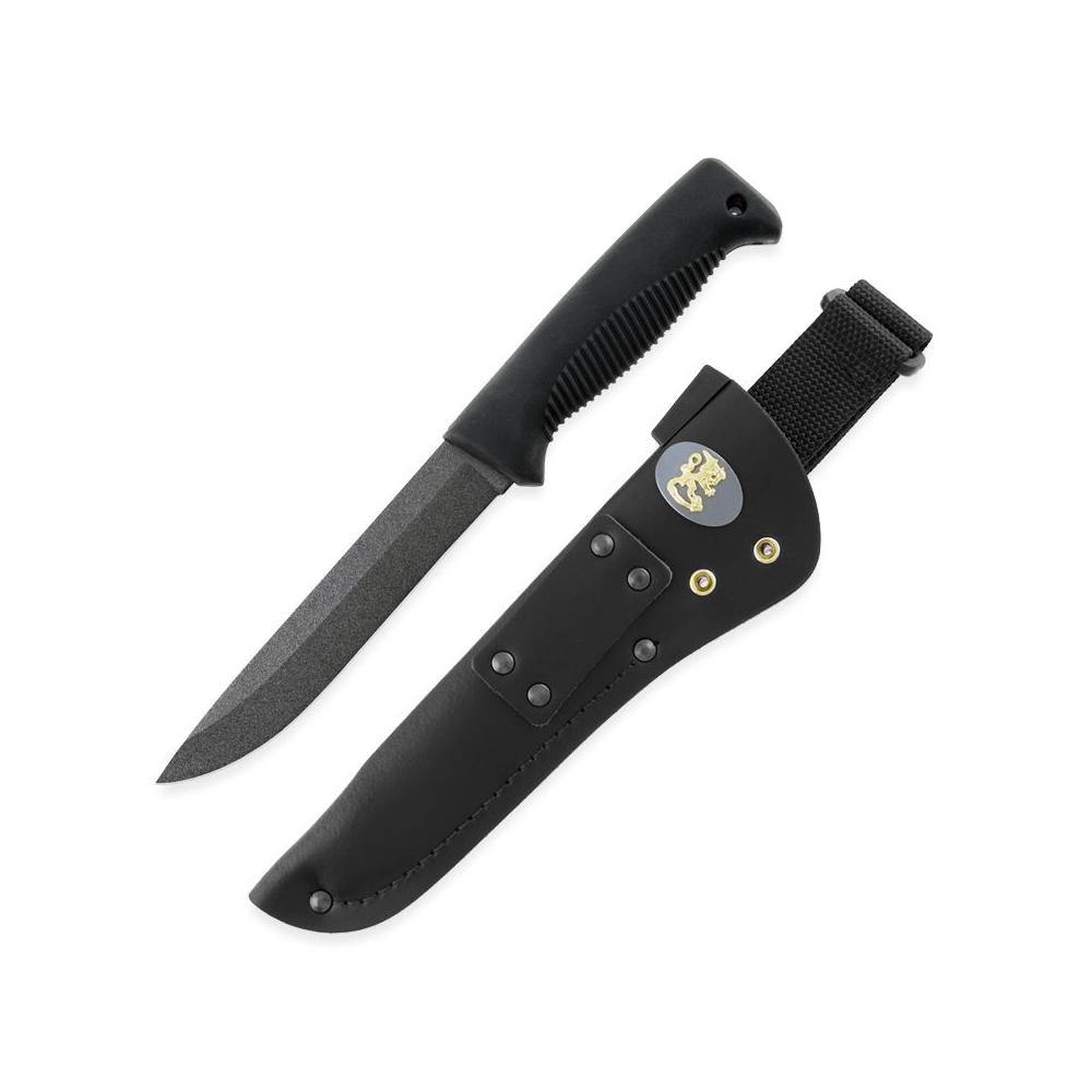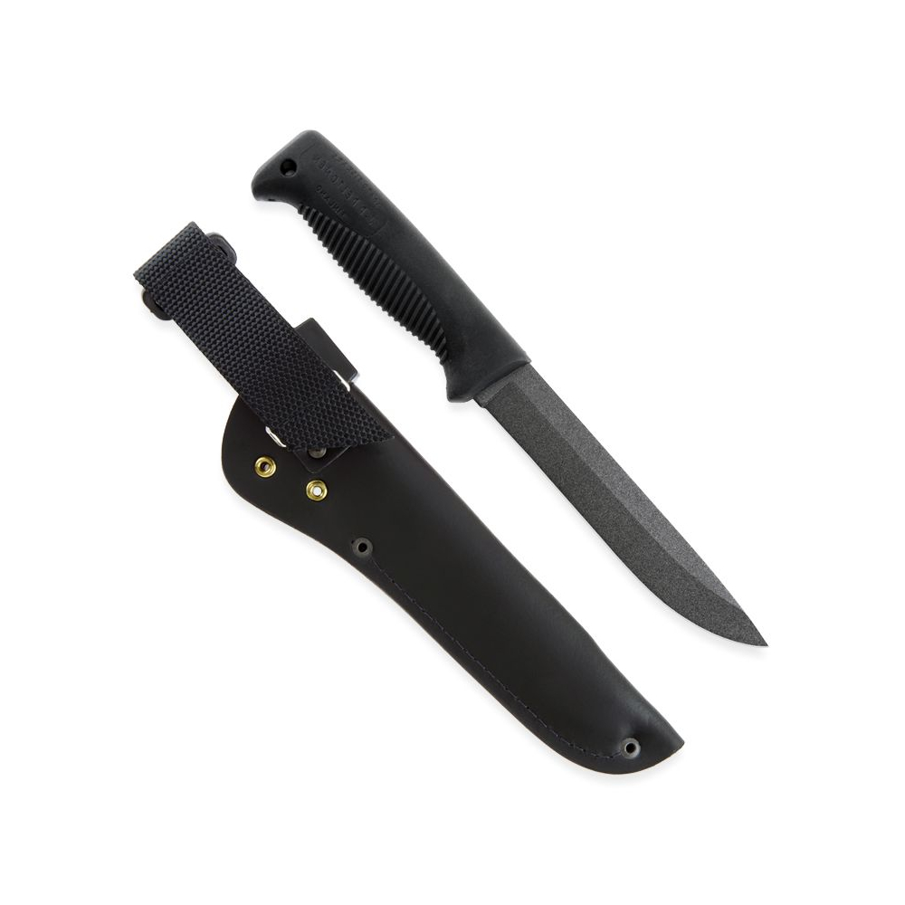 The Ranger knife was designed by J-P Peltonen, captain of the Finnish Defence Forces. Carbon steel blade with Teflon coating, Thermoflex polymer handle, leather sheath.