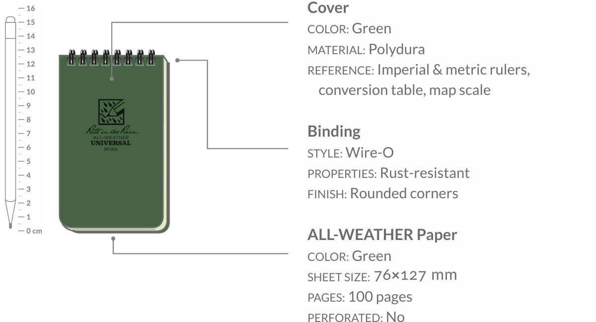 "Rite in the rain" is a special waterproof paper suitable for use in all weather conditions. In the African jungle, in the Alaskan winter, in the sweat and grime of the Iraqi desert, "Rite in the Rain" will always ensure that your notes will last!