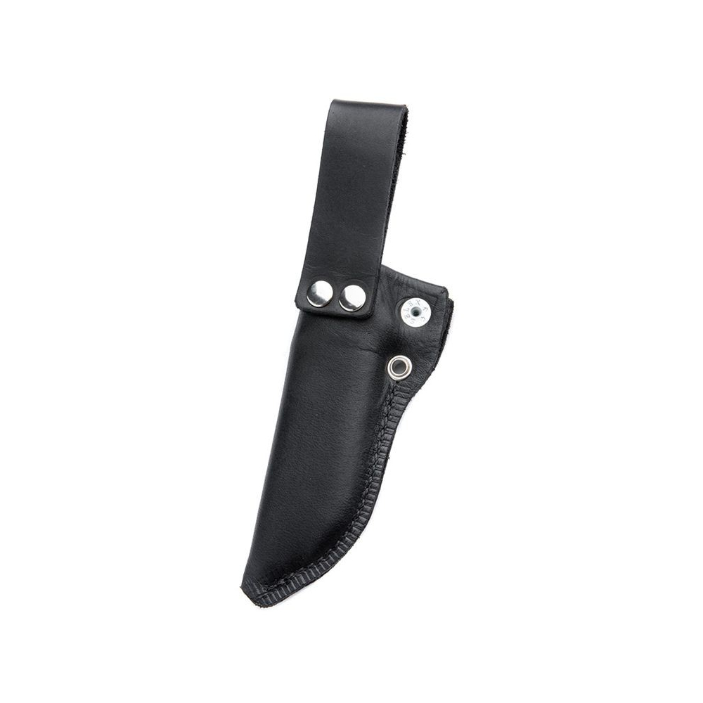 The rustic leather holster consists of a plastic insert and traditional Finnish holster construction. The plastic liner is roomy enough to allow water to flow around the knife, which spills out through a small hole at the end of the sheath. Around the mouth of the sheath, the leather is folded over twice, creating a strong and rigid wide band that wraps tightly around the handle of the knife. To secure the knife, you can also use a stud to tighten the mouth even further. When you draw the knife, the blade moves smoothly between the leather sides and does not cut them, a traditional advantage of Finnish puukko-style sheaths. Even without using the stud, the sheath retains enough rigidity to keep the knife in place, so you don't have to keep opening and closing the stud as you work around camp. Just remember to close it when you go to move it!