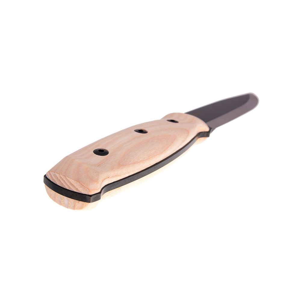 Solidna rękojeść wykonana z unikalnego drewna jesionowego wyposażona jest w osłonę palców, funkcjonalną stopkę rękojeści oraz czarne ostrze o grubości 3,2 mm wykonane z przetworzonej szwedzkiej stali nierdzewnej. Co w połączeniu ze specjalnie zaprojektowaną krzywizną ostrza zapewnia wytrzymałość i stabilność przy każdym cięciu. Nóż został stworzony z myślą o trudnych wyzwaniach i posiada wzorcowe cechy dla tych, którzy potrzebują bezpiecznego i solidnego narzędzia. Czarne wykończenie PC tworzy zrównoważony kontrast pomiędzy jasnym drewnem jesionowym a błyszczącą krawędzią ostrza. Skórzana pochewka posiada szlufkę na pasek i chroni ostrze.