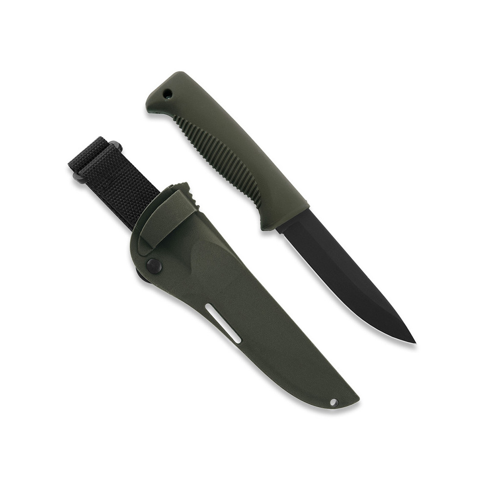 Krótka wersja fińskiego noża wojskowego J-P Peltonen M95 Ranger z czarnym ostrzem i kompozytową pochwą