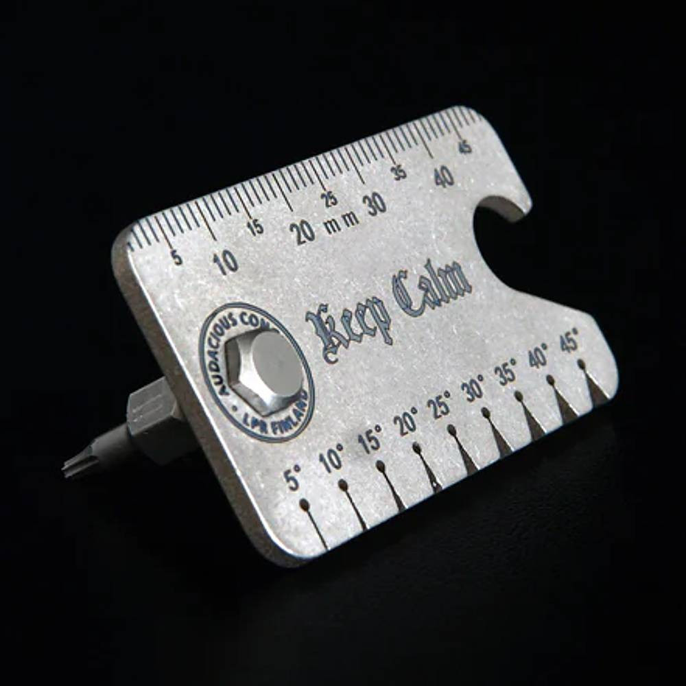 Ľahký titánový nástroj vo veľkosti psej známky. Ponúka meranie uhlov, pravítko, držiak bitov 1/4", skrutkovač aj otvárač. Ideálny doplnok na kľúče na každodenné použitie.