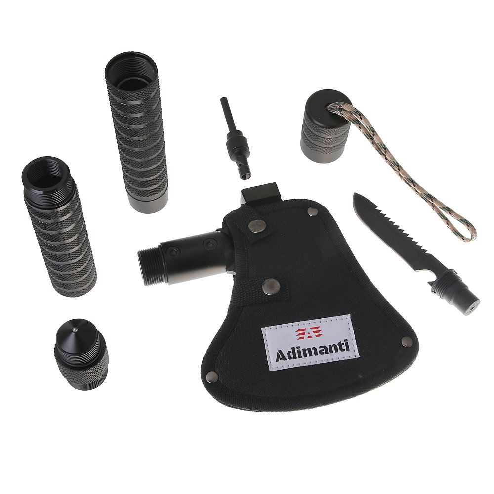 Multifunkčná sekera Adimanti AXE-003 pre outdoor a survival. Hadfieldova oceľ, hliníková rukoväť, nôž, firesteel, kompas aj píšťalka v jednom nástroji.