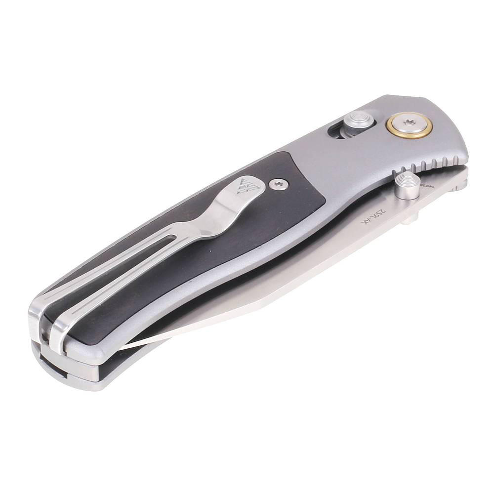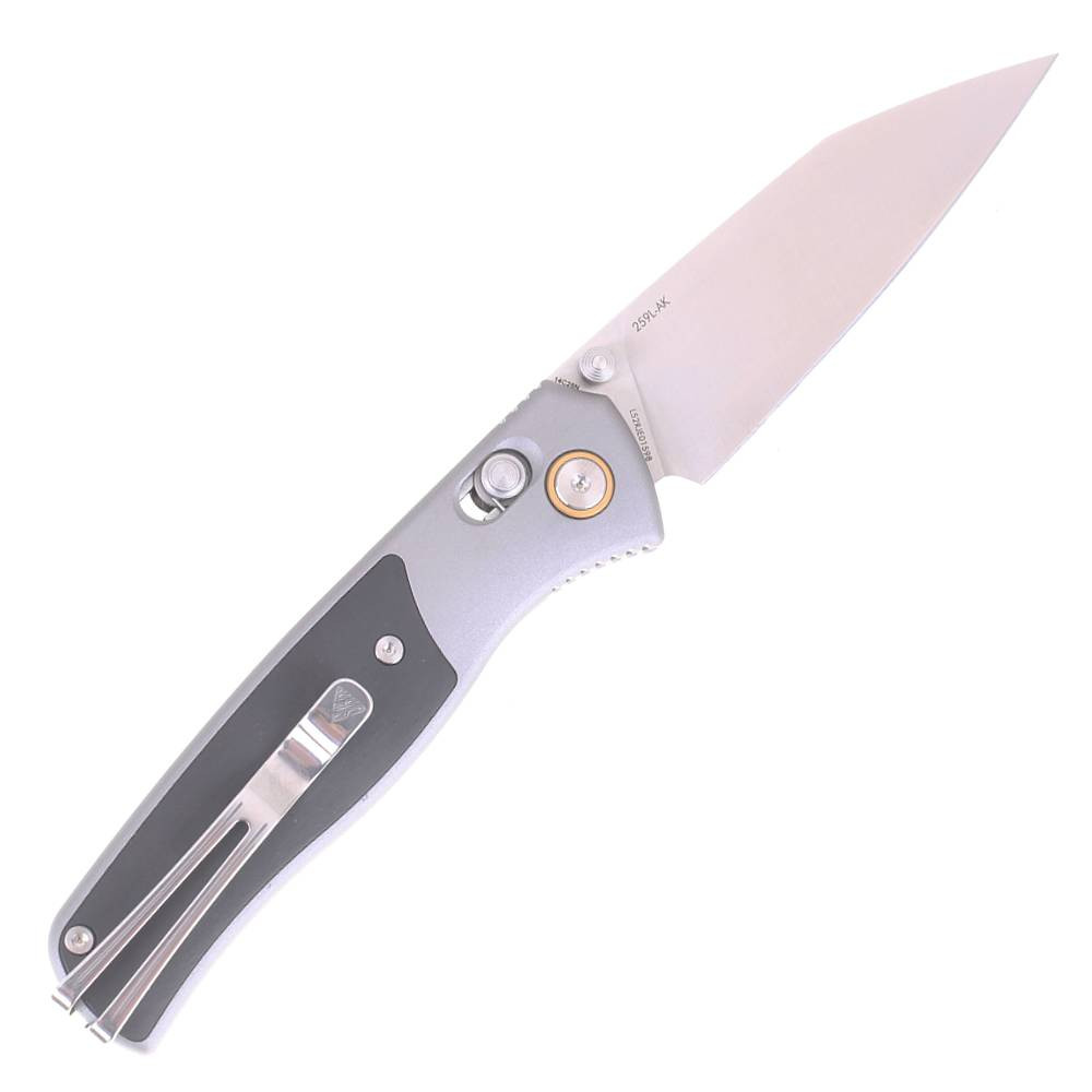 SRM 259L-AK, oceľ Sandvik 14C28N, zámok Ambi-Lock, rukoväť zo šedého eloxovaného hliníka 6063 s vložkami z ebenového dreva