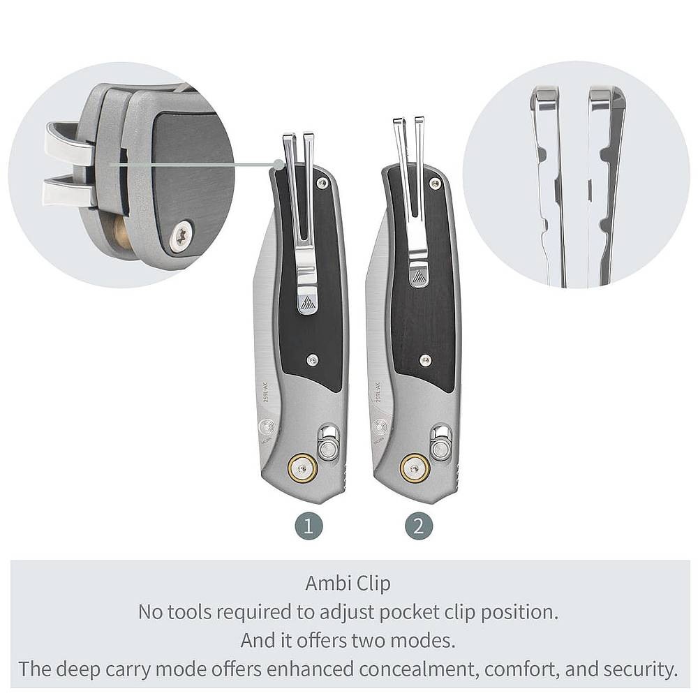 Otváranie noža je hladké a pohodlné vďaka kolíku na čepeli, pričom bezpečnosť pri práci zaisťuje zámok Ambi-Lock - spoľahlivý mechanizmus pre pravákov aj ľavákov. Je vybavený obojstranným vreckovým klipom na nosenie s hlbokým vyklápaním a otvorom na šnúrku, ktorý umožňuje prispôsobenie osobným preferenciám.